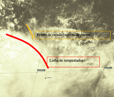 A situação de seca predominante sobre a Região Sudeste do Brasil vem contribuindo para a redução da umidade disponível nos solos. Nas últimas semanas do mês de setembro foram observadas temperaturas elevadas, inclusive com recordes em diversas localidades do centro do país. Foi identificado uma onda de calor que persistiu entre os dias 19 a 21 de setembro na região que abrange as cidades atingidas pelas tempestades de poeira, reforçando a condição seca e quente tipicamente observada durante a estação seca do Brasil central. Entretanto, na última semana de setembro observou-se uma mudança nos padrões atmosféricos entre o Centro-Oeste, o Sudeste e o Sul do Brasil com a ocorrência de tempestades localizadas. Na Figura 1 é mostrada a situação ocorrida na região de Presidente Prudente – SP no dia 01/10/2021. É possível observar uma linha de instabilidade entre o extremo norte do Paraná e o oeste do estado de São Paulo, caracterizada pela organização em linha de um conjunto de tempestades. Na dianteira da linha de instabilidade, verifica-se a frente de rajada que levantara as partículas do solo e formaram a intensa nuvem de poeira na região. É importante salientar que além da nuvem de poeira, a frente de rajada provocou ventos intensos. Rajadas de até 107 km/h foram registradas no aeroporto de Presidente Prudente às 12h local.