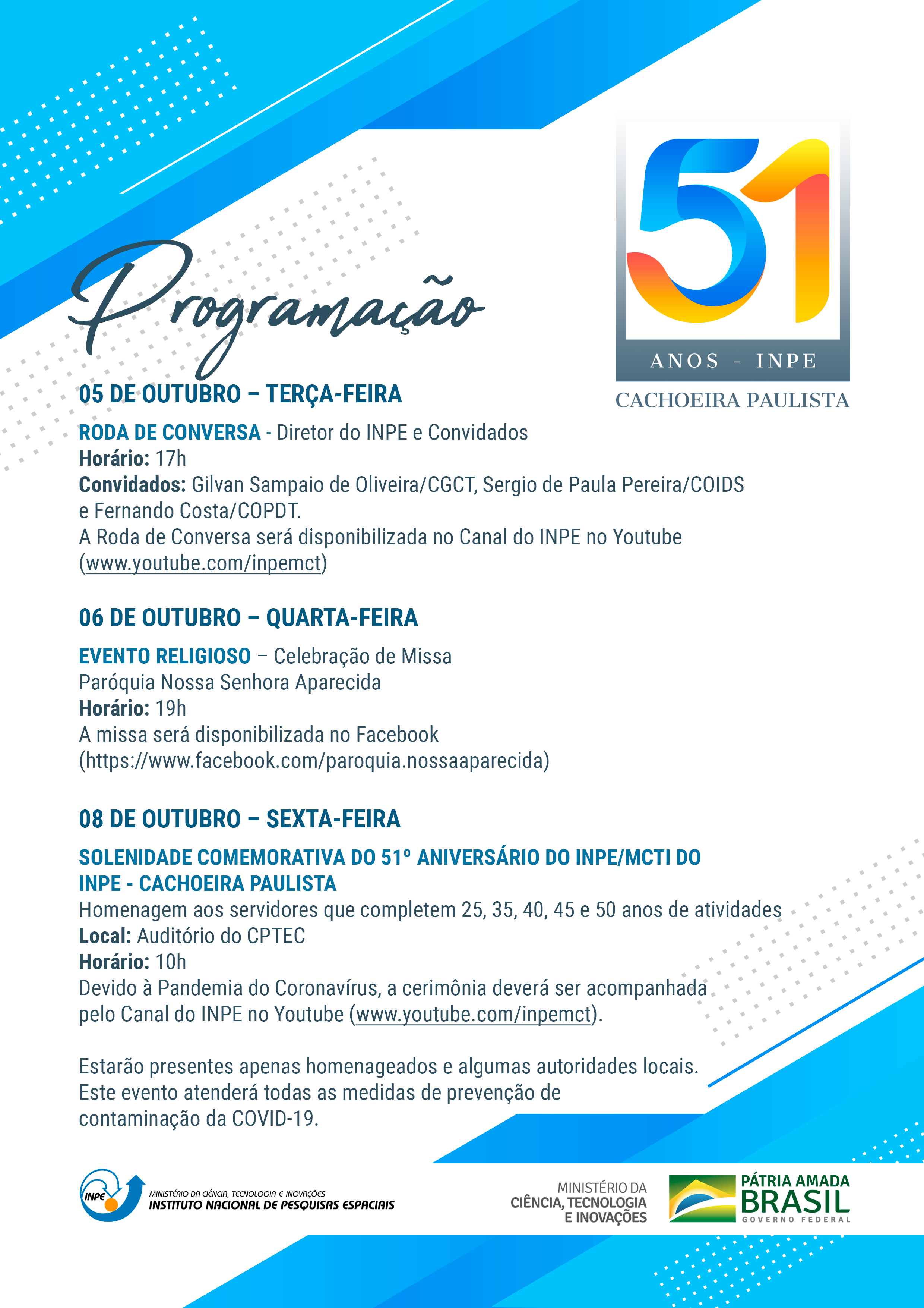 A Unidade de Cachoeira Paulista do Instituto Nacional de Pesquisas Espaciais (INPE), do Ministério de Ciência, Tecnologia e Inovações (MCTI), comemora 51 anos de atividades. A cerimônia de comemoração ocorrerá em 8 de outubro de 2021, às 10 horas, sexta feira.