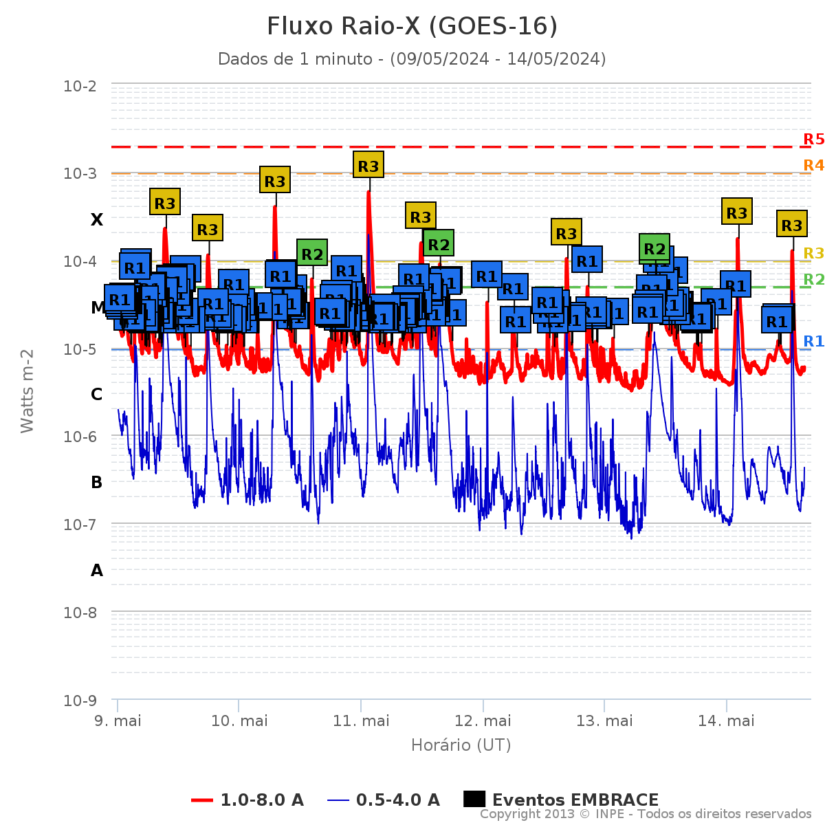 Outras poderosas explosões solares, com ejeção de massa, ocorreram desde o dia 8 de maio, originadas da região de manchas solares 13663 e 13664. Estas explosões solares, classificadas como explosões de intensidade de emissão de raios X do tipo M e X, que alcançam escalas de R1 à R5, representam riscos para a atmosfera superior da Terra e para a infraestrutura tecnológica. Veja o número imenso de alertas emitidos para essas emissões em raios X na figura do fluxo de Raios-X. Foram explosões fortes (R3) e moderadas (R2). Contamos nesse período 8 R3, 3 R2 e muitas de menor impacto R1.