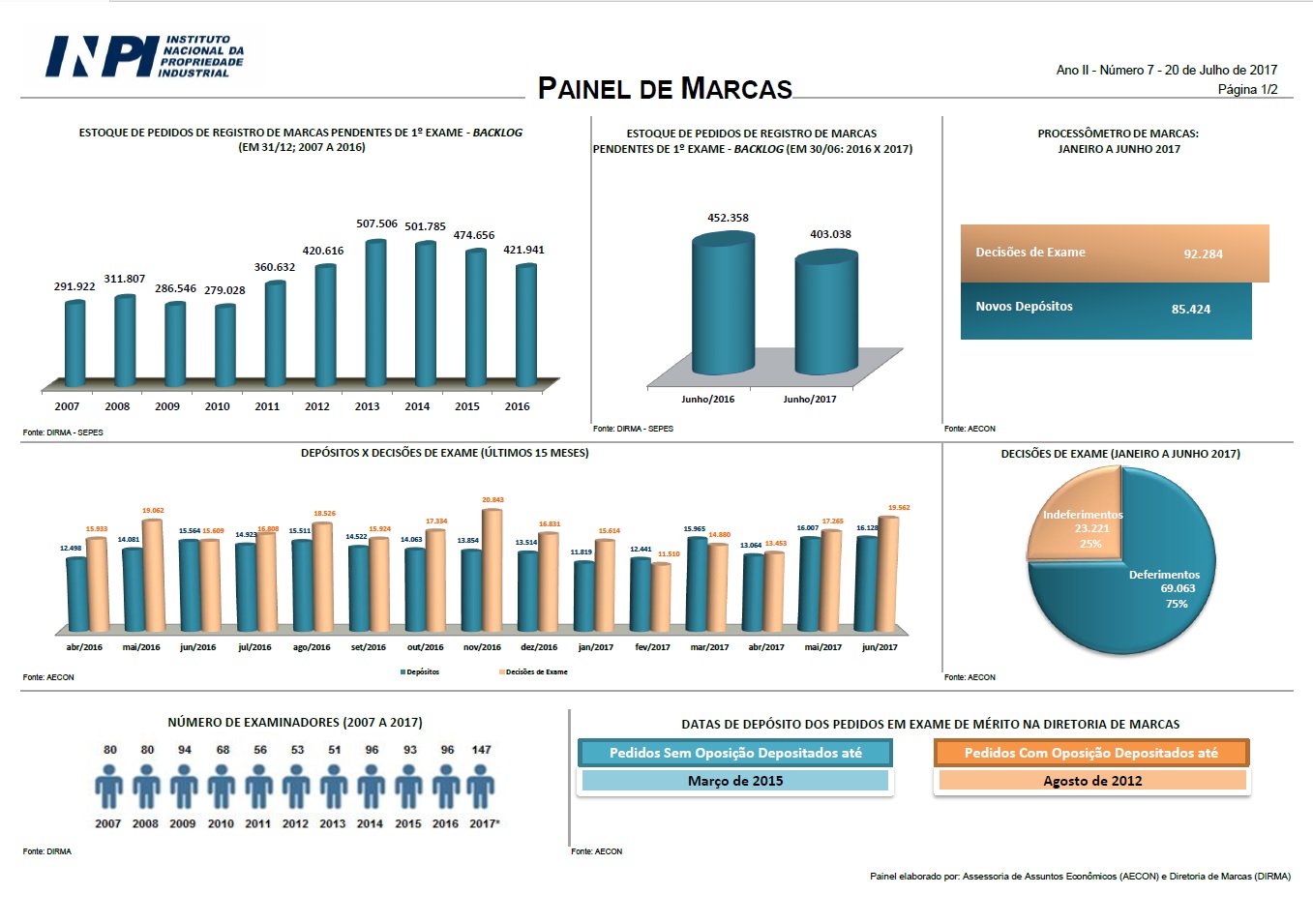 Divulgado mensalmente, o Painel de Marcas apresenta os principais indicadores da Diretoria de Marcas, Desenhos Industriais e Indicações Geográficas (DIRMA) relativos a marcas. O objetivo do novo produto é conferir transparência aos resultados alcançados pelo INPI na gestão dos pedidos de marcas, assim como aos tempos de espera para exame dos processos.