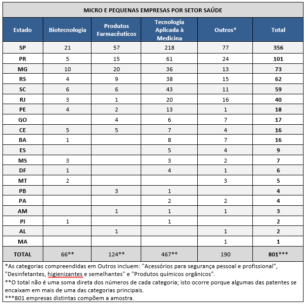 O estudo identificou 801 micro e pequenas empresas em todo o Brasil atuantes nas áreas de biotecnologia, produtos farmacêuticos, tecnologia aplicada à medicina e outras. A análise dos dados mostrou que 44,4% dessas empresas estão localizadas nos estados de São Paulo (22,7%), Paraná (12,6%) e Minas Gerais (9,1%). Os dados permitiram ainda a construção de um ranking dos estados com maior concentração de micro e pequenas empresas inovadoras do setor de saúde (tabela abaixo).