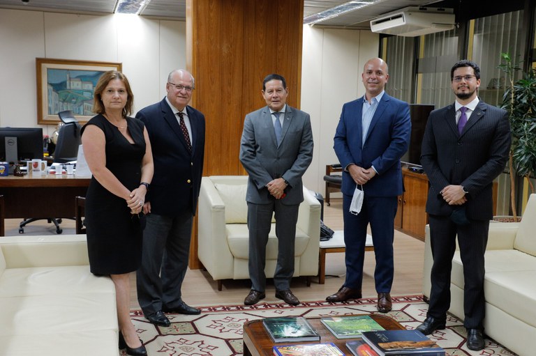 Novas diretrizes são apresentadas ao vice-presidente da República, general Hamilton Mourão (centro). À esq., Cláudia Magioli e Cláudio Vilar Furtado (INPI). À dir., Carlos Da Costa e Igor Nazareth (SEPEC/ME)