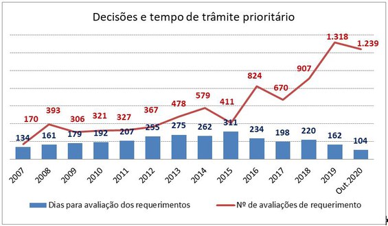 Outro indicador importante é a queda do tempo médio de avaliação dos requerimentos de trâmite prioritário. Até outubro de 2020, foram avaliados 1.239 com tempo médio de 104 dias, contra 907 requerimentos em 2018 com 220 dias. Esse resultado foi alcançado por meio da simplificação do fluxo do processo e da utilização de novas ferramentas de tecnologia da informação a partir de 2019 , mesmo com a redução em dois terços do quantitativo de examinadores dedicados a esta atividade.