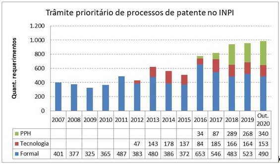 Até o mês de outubro, o INPI recebeu 983 requerimentos de trâmite prioritário de processos de patentes, superando os 955 de todo o ano de 2019. A previsão é o total chegar a 1.080 requerimentos até dezembro de 2020. O crescimento foi puxado pela modalidade Patent Prosecution Highway (PPH), cujos processos são de matéria considerada patenteável por um escritório parceiro do Instituto. O aumento de 268 requerimentos em 2019 para 340 até outubro de 2020 pode ser explicado porque o PPH passou a aceitar processos de patente de qualquer campo tecnológico.