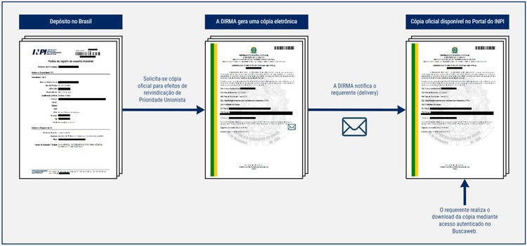 Uma vez disponível a cópia oficial, o requerente receberá também uma notificação no endereço de e-mail constante de seu cadastro nos sistemas do INPI, conforme exemplo abaixo: