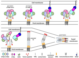 Artigo revisa as informações cruciais sobre como o SARS-CoV-2 se liga à superfície das células hospedeiras por meio de uma variedade de receptores, como ECA2, neuropilina-1, AXL e complexos anticorpo-FcγR. Os pesquisadores explicam como sua proteína spike (S) sofre transição conformacional da pré-fusão para a pós-fusão com a ajuda de proteases como furina, TMPRSS2 e catepsinas. Em seguida, a revisão cita os estudos experimentais em andamento e os ensaios clínicos de anticorpos, peptídeos ou compostos de pequenas moléculas com atividade anti-SARS-CoV-2 e discuti-se como essas terapias antivirais que visam a interação patógeno-hospedeiro poderiam potencialmente suprimir a ligação viral, reduzir a exposição do peptídeo de fusão para reduzir a fusão da membrana e bloquear a formação do núcleo de fusão do feixe de seis hélices (6-HB)(11/06/2021). Fonte: Nature