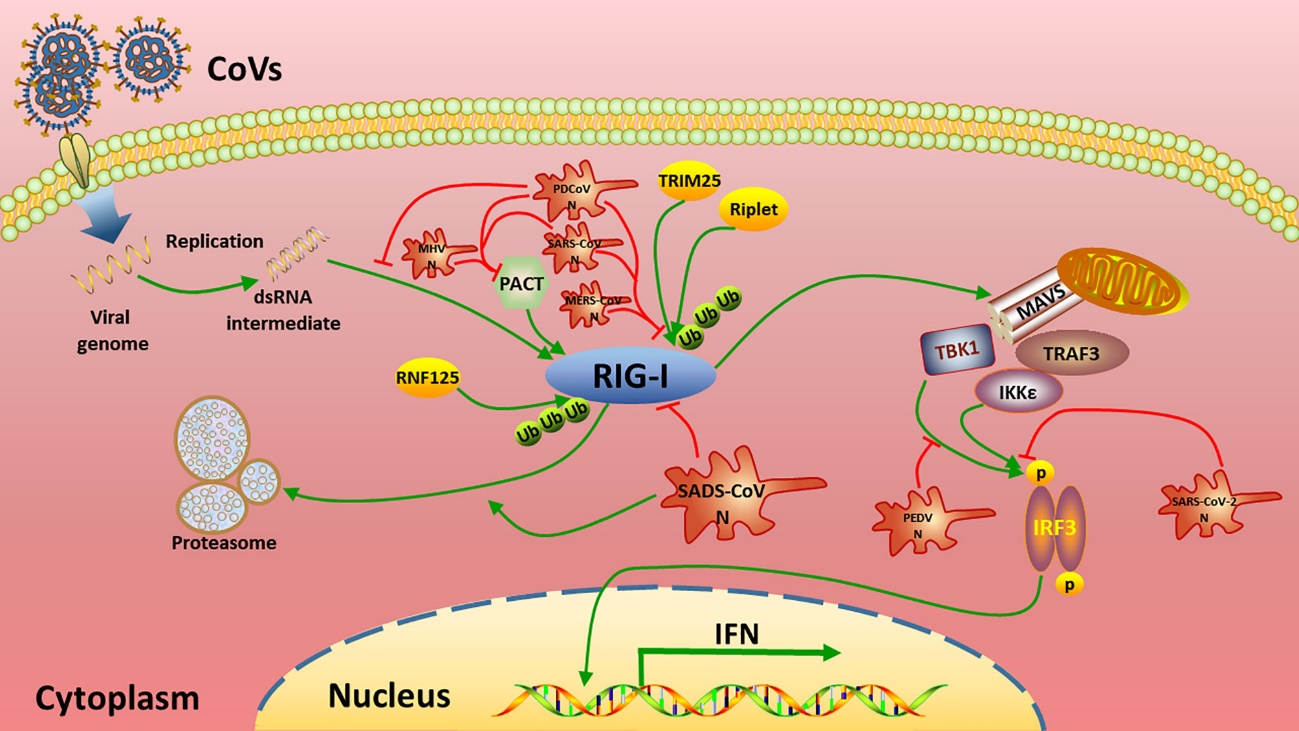 Como a proteína viral mais abundante nas células infectadas logo após a etapa de entrada, a proteína do nucleocapsídeo (N) do SARS-CoV-2 provavelmente desempenha um papel fundamental na interrupção do IFN. Neste artigo, pesquisadores conduziram uma análise comparativa abrangente e relataram que as proteínas N de coronavírus humanos e de animais (SADS-CoV, PEDV, SARS-CoV, SARS-CoV-2, MERS-CoV, IBV e PDCoV) suprimem as respostas IFN por estratégias múltiplas. Em particular, descobriu-se que a proteína N de SADS-CoV interagiu com RIG-I independente de sua atividade de ligação de RNA, mediando a ubiquitinação ligada a K27, K48 e K63 de RIG-I e sua subsequente degradação dependente de proteassoma, inibindo assim a resposta do IFN do hospedeiro. Esses dados fornecem informações sobre a interação entre CoVs e hospedeiro e oferecem novas pistas para o desenvolvimento de terapias contra esses vírus importantes (16/06/2021). Fonte: Frontiers in Immunology