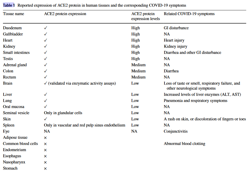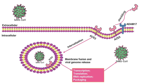 O novo papel duplo da ECA2 que inicialmente regulava o sestema renina-angiotensina e agora foi identificada como receptor SARS-CoV-2 o que leva a compreender a alta taxa de mortalidade dos pacientes, pois a alta afinidade SARS-CoV-2 com ECA2 leva a entrada viral e a doenças multissistêmicas com sistema pulmonar, intestinal, renal, sistema nervoso central e manifestações cardiovasculares (10/05/2020). Fonte: European Heart Journal