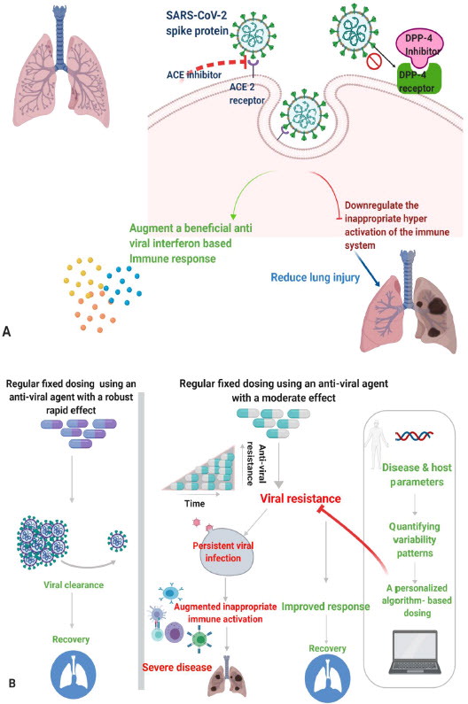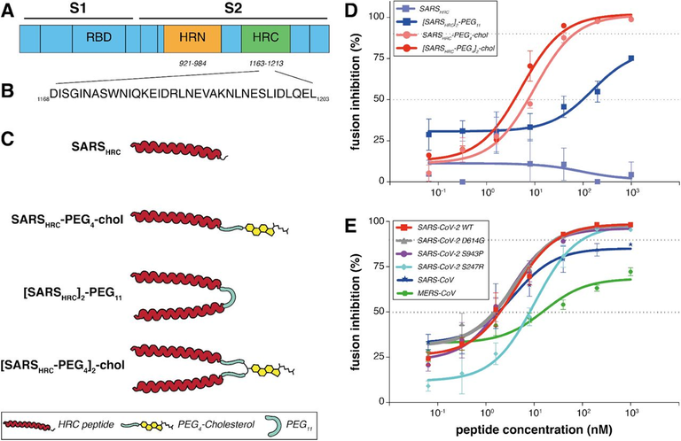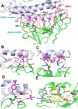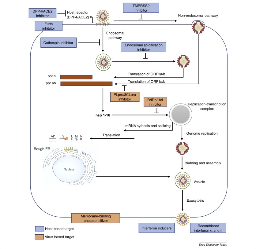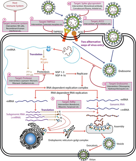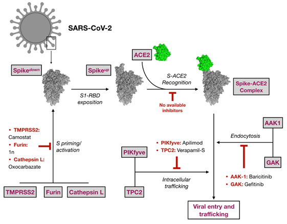 Revisão destaca os avanços recentes na pesquisa de medicamentos antivirais que têm como alvo a proteína spike altamente exposta. Uma estratégia potencial envolve a interrupção da interação da proteína S do SARS-CoV-2 com os receptores da célula hospedeira através de anticorpos neutralizantes direcionados ao domínio de ligação do receptor na subunidade S1, pequenos inibidores de peptídeos, inibidores de fusão de peptídeos contra S2, células hospedeiras enzimas conversoras de angiotensina 2 (ECA2) e inibidores de protease, com o objetivo de abrir caminho para o controle da entrada nas células virais (20/05/2021). Fonte: Viral Immunology