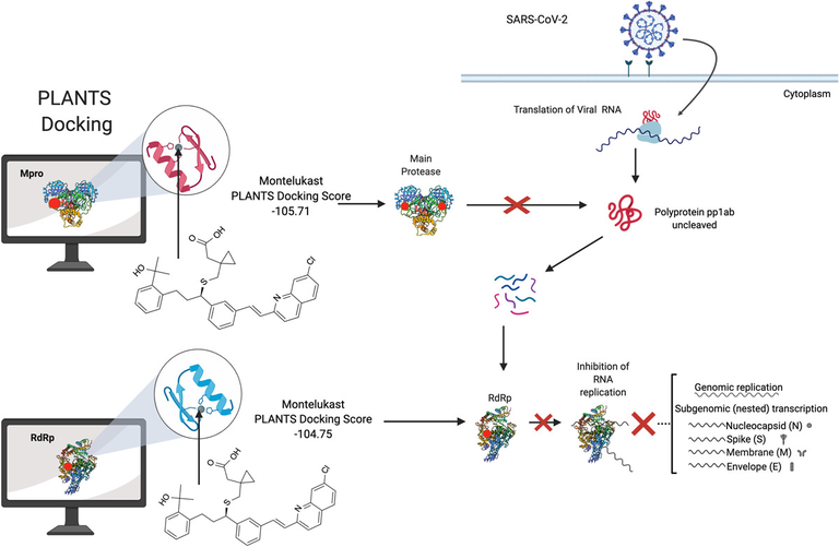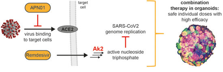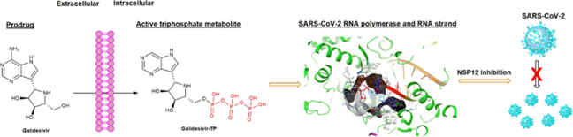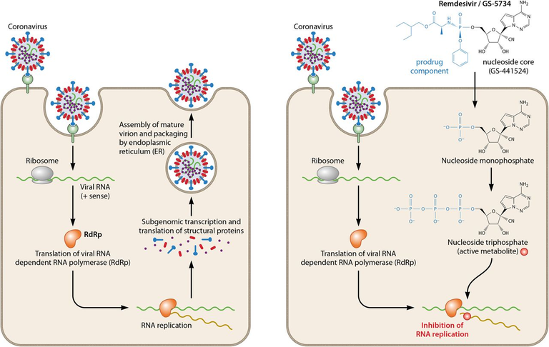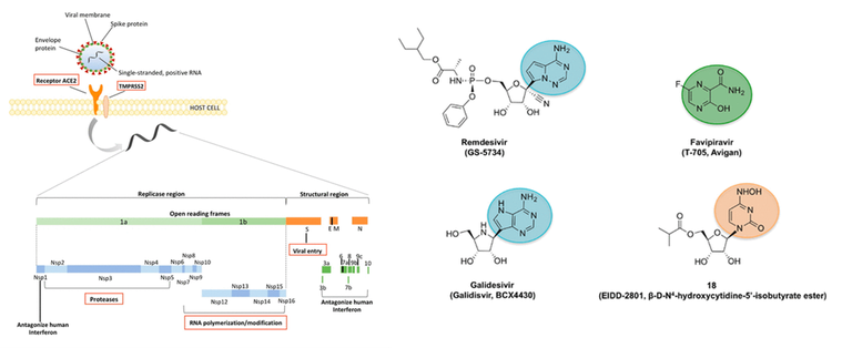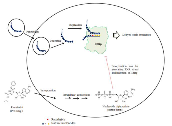 O pró-fármaco análogo de nucleotídeo remdesivir permanece como única molécula química antiviral aprovada pela FDA para o tratamento da infecção com SARS-CoV-2. Estudos bioquímicos revelaram que a forma ativa do fármaco tem como alvo a RNA polimerase dependente de RNA viral e causa o atraso da terminação da cadeia. A terminação de cadeia atrasada é incompleta, mas a continuação da síntese de RNA permite um escape parcial da revisão viral. O remdesivir fica embutido na cópia do genoma do RNA que mais tarde serve como modelo. A incorporação de um trifosfato de nucleotídeo de entrada é agora inibida pelo modelo modificado. A inibição enzimática se liga aos efeitos antivirais em culturas de células, modelos animais e redução da carga viral em pacientes, o que fornece a cadeia lógica esperada para um antiviral de ação direta (12/05/2021). Fonte: Current Opinion in Virology