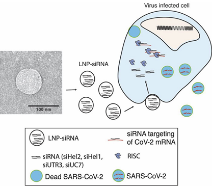 Estudo apresenta um siRNA terapêutico eficaz contra a infecção por SARS-CoV-2 usando uma nova nanopartícula lipídica de sistema de entrega. Múltiplos RNAs de pequena interferência (siRNAs) direcionados com regiões conservadas do vírus SARS-CoV-2 foram rastreadas e três siRNAs candidatos emergiram que efetivamente inibiem o vírus em mais de 90%, sozinho ou em combinação um com o outro. A abordagem terapêutica de siRNA-LNP pode ser altamente útil no tratamento da doença COVID-19 como uma terapia adjuvante às estratégias de vacinas atuais (05/05/2021). Fonte: Jounal Pre-proof