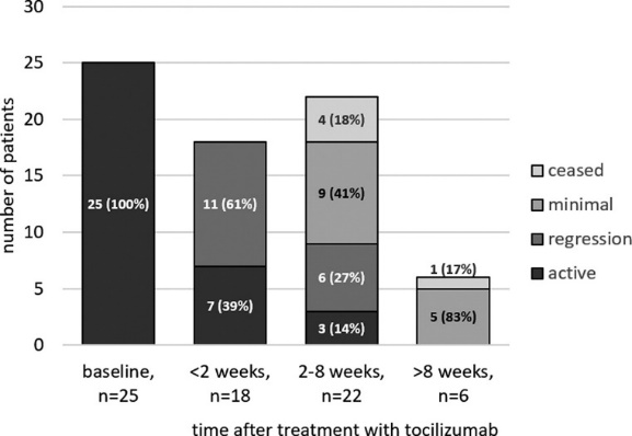 Estudo buscou avaliar os resultados clínicos de acordo com o tratamento imunossupressor administrado a pacientes com pneumonia SARS-CoV-2 grave e inflamação moderada. Um estudo de coorte observacional retrospectivo envolvendo 142 pacientes com pneumonia COVID-19 grave e inflamação moderada divididos em três grupos de tratamento (pulsos de metilprednisolona sozinho [grupo I], tocilizumabe sozinho [grupo II] e metilprednisolona mais tocilizumabe [grupo III]). O objetivo foi avaliar as diferenças intergrupos no curso clínico com um acompanhamento de 60 dias e fatores analíticos relacionados. O tocilizumabe parece não estar associado a melhores desfechos clínicos e deve ser reservado para cenário de ensaio clínico, uma vez que seu uso generalizado pode resultar em maior taxa de admissão em UTI e maior tempo médio de internação sem diferenças na taxa de mortalidade e eventos potencialmente adversos (24/05/2021). Fonte: Medicina Clínica