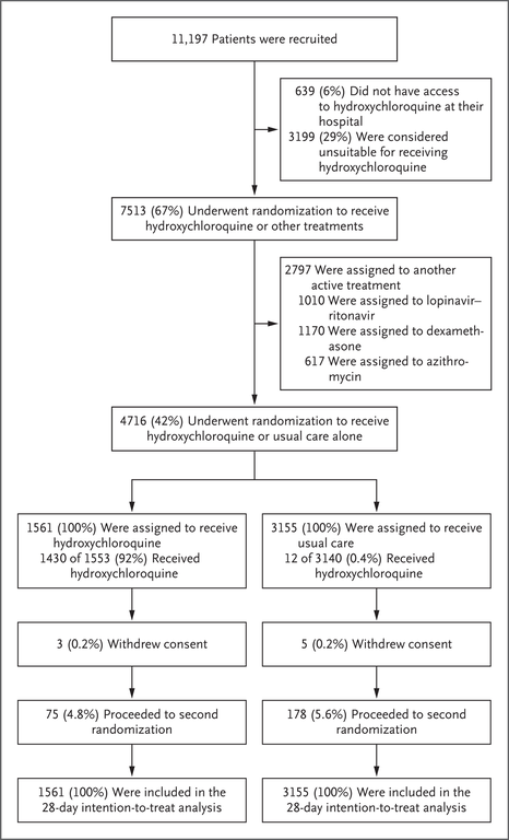 Estudo com 250 pacientes onde 123 placebos e 124 utilizando hidroxicloroquina demonstrou baixa potência envolvendo principalmente pacientes mais velhos (acima de 77 anos) com COVID-19 leve a moderado, os pacientes tratados com hidroxicloroquina não tiveram melhores resultados clínicos ou virológicos do que aqueles que receberam o placebo (31/03/2021). Fonte: Clinical Microbiology and Infection