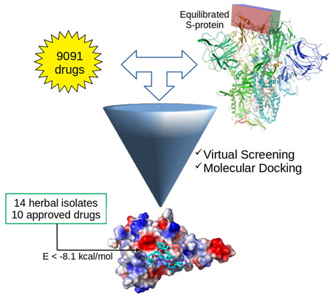 Estudo onde 61 moléculas já usadas na clínica médica como antivirais foram analisadas em um estudo via Docagem Molecular. Dessas 61 moléculas, 37 interagiam com mais de 2 estruturas de proteínas do COVID-19. Os resultados indicam que inibidores de HIV protease e inibidores de RNA polimerase RNA-dependentes mostraram características promissoras de ligação às enzima de COVID-19 (Pre-proof - 09/04/2020). Life Sciences