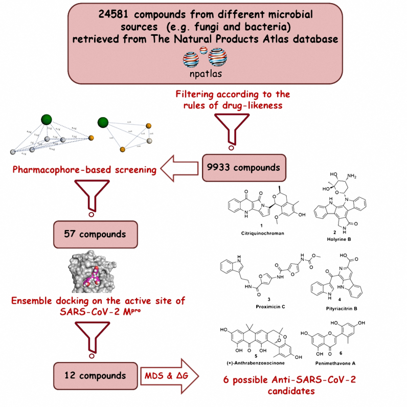 A prevenção da atividade biológica da principal protease SARS-CoV-2 usando compostos naturais é de grande interesse. Nesse contexto, usando uma combinação de AutoDock Vina e simulações de tração rápida de ligante, onze compostos de fungos marinhos foram identificados que provavelmente atuam como inibidores Mpro de SARS-CoV-2 altamente potentes para prevenir a replicação viral. Em particular, quatro compostos, incluindo M15 (3-O- (6-O-α-L-arabinopiranosil) -β-D-glucopiranosil-1,4-dimetoxixantona), M8 (wailupemicinas H), M11 (cottoquinazolinas B), e M9 (wailupemicinas I) (23/06/2021). Fonte: Royal Society of Chemistry