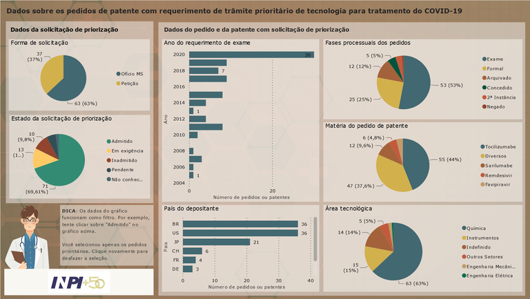 O INPI criou uma modalidade de trâmite prioritário de pedidos de patente relacionada “a produtos e processos farmacêuticos e a equipamentos e/ou materiais de uso em saúde, para o diagnóstico, profilaxia e tratamento da COVID-19”. Até o momento já foram solicitados 100 requerimentos de priorização. Dos 71 pedidos admitidos até o momento no programa, 53 estão em exame técnico e 5 já foram concedidos. 30 pedidos são recentes, com data de depósito no ano de 2020 e 36 pedidos são de depositantes brasileiros. Fonte: INPI