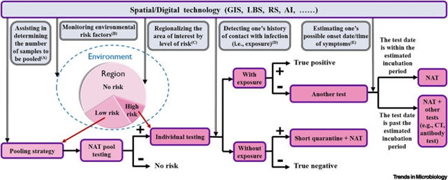 Os autores propõem o uso de ferramentas de monitoramento da infecção pelo espaço geográfico, com diferentes tipos de testagem e avaliação com uso de IA para detecção de clusters de contaminação e manejo de recursos e medidas preventivas de saúde (14/03/2021). Fonte: Trends in Microbiology