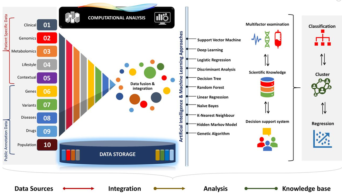Pesquisadores recomendam a implementação automatizada de tecnologias de ponta, utilizando abordagens de machine learning (ML) e inteligência artificial (AI) para agregação de dados multimodal, exame multifatorial, desenvolvimento de base de conhecimento de preditores clínicos para suporte à decisão e melhores estratégias para lidar com dados relevantes. Segundo o artigo, a medicina de precisão permitirá que os médicos integrem dados de saúde com ensaios e testes direcionados para identificar e avaliar biomarcadores e riscos de doenças, determinar variantes genéticas acionáveis em pacientes, obter a imagem completa do metaboloma e mapear metabólitos para os caminhos da doença (02/10/2020). Fonte: Human Genomics