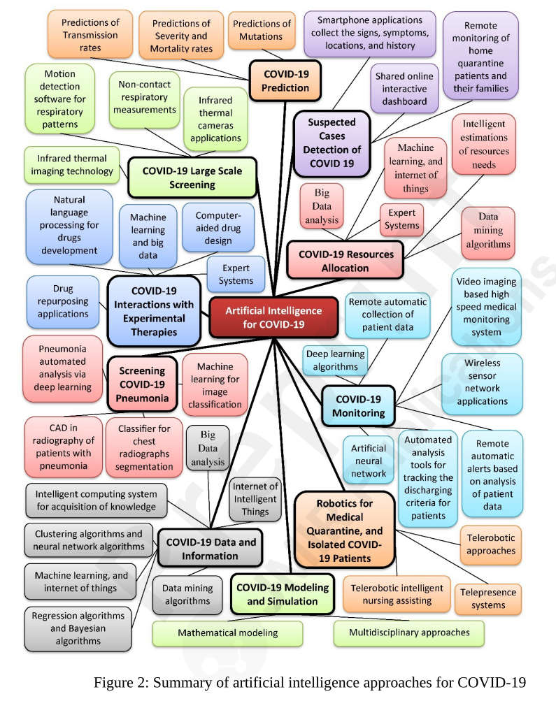 O desenvolvimento contínuo de inteligência artificial (IA) e machine learning (ML), desde epidemias anteriores, colaborou significativamente nos processos de tratamento, medicação, triagem, previsão, rastreamento de contatos e de desenvolvimento de medicamentos/vacinas na pandemia da COVID-19, com redução da intervenção humana na prática médica. No entanto, os modelos ainda poderão ser aperfeiçoados para o enfrentamento da epidemia de SARS-CoV-2 (25/06/2020). Fonte: Chaos, Solutions and Fractals