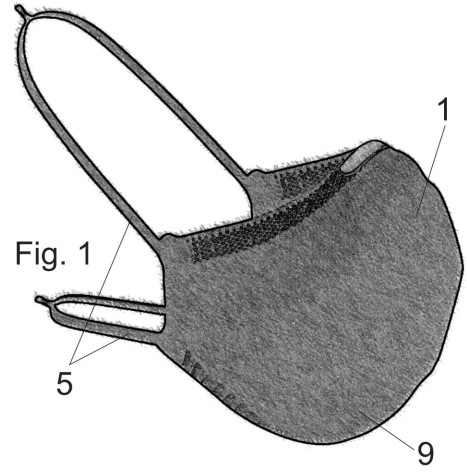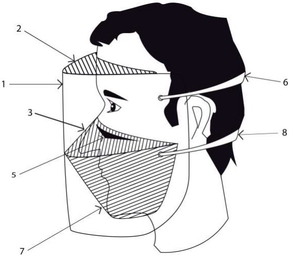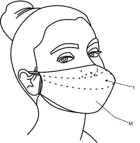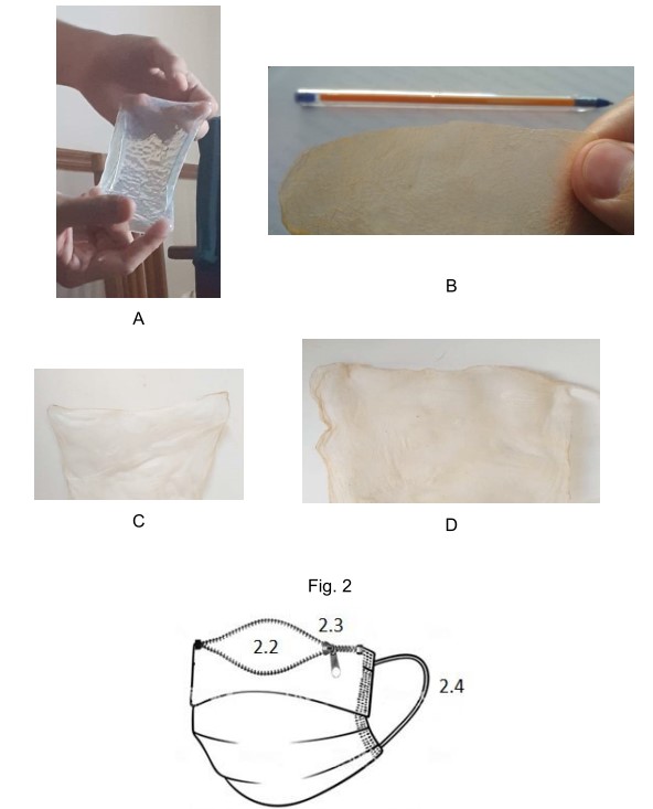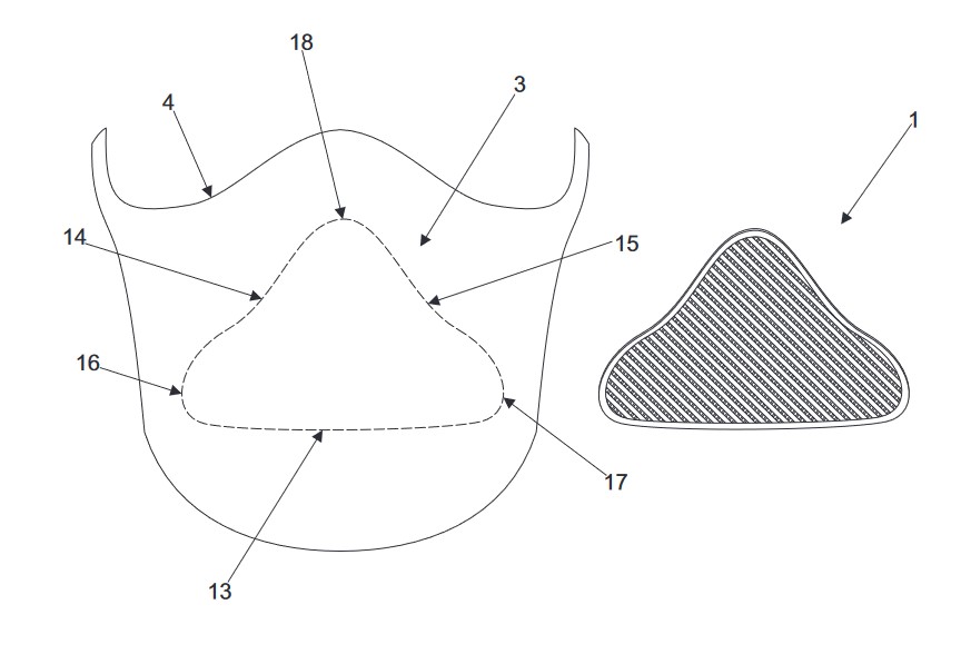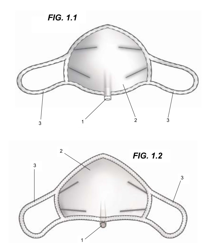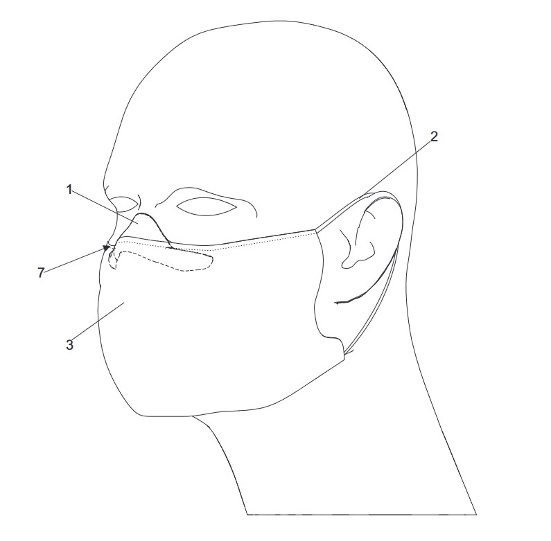O pedido de patente de modelo de utilidade n° BR 202020007179-9 dos brasileiros MARCOS RIBEIRO HONORATO (BR/MG), JOANA DARC DA SILVA NASCIMENTO (BR/MG) e LEDA MÁRCIA SILVA SUAID (BR/MG) foi publicado em 19 de outubro de 2021. O pedido de patente refere-se a uma disposição construtiva a ser aplicada em uma máscara de proteção individual caracterizada por não possuir tiras ou elásticos para fixação, mas sim uma camada envoltória de material aderente à pele que confere à máscara uma proteção muito superior às demais, uma vez que todo o seu perímetro fica aderido ao rosto do usuário, não apresentando qualquer fresta de entrada de material contaminante. A presente invenção é basicamente constituída de uma máscara de proteção individual sem elásticos ou tiras de fixação (1), mas dotada em todo o seu perímetro interno de uma camada envoltória de material aderente (2), protegida por um filme plástico (3).