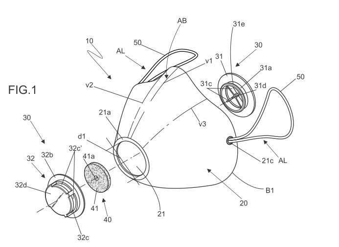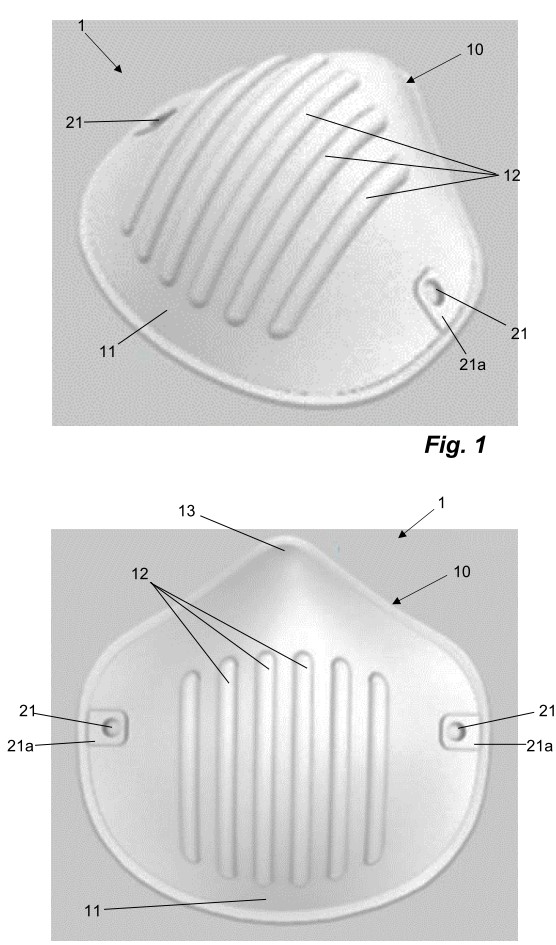 O pedido de patente de modelo de utilidade n° BR 102021001085-1 do brasileiro CLAUDIO MORAES PARADINHA foi publicado em 02 de agosto de 2022. O pedido de patente refere-se a aperfeiçoamentos introduzidos em máscara facial de proteção individual reutilizável. Trata-se de máscara facial (10) do tipo utilizada por profissionais de saúde e/ou usuários comuns reforçando a proteção contra doenças virais como a causada pelo vírus COVID-19 ou outro tipo de vírus, cujo contágio pode ser efetivado através das vias respiratórias; dita máscara (10) é formada por corpo (20) confeccionado em etileno acetato de vinila, termoformada - EVA - atóxico ou outro material adequado como espuma de poliuretano, polietileno D-35 ou outro correlato como laminado de PET, PVC, OS, PE ou silicone ou borracha esponjosa formada por peça única termoformada ordinariamente troncônica e oca provida de base alargada (B1) de onde se desenvolve a parede afunilada até extremidade de topo plano onde é praticado orifício (21) com diâmetro (d1) e borda plana (21a); dito orifício (21) é dimensionado de maneira a receber um dispositivo respirador (30) com filtro discoide e laminar (40). O pedido de patente está pendente de decisão, aguardando o início do exame técnico no INPI.