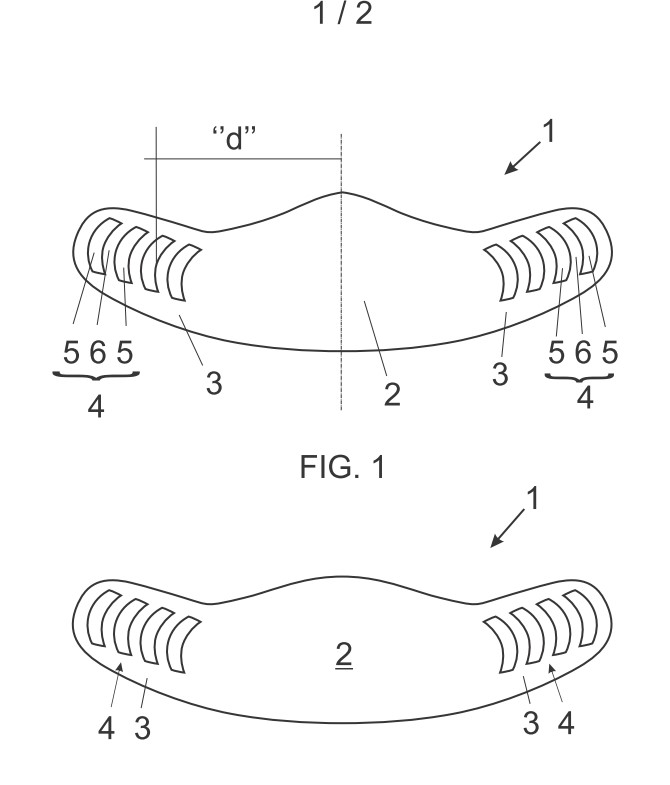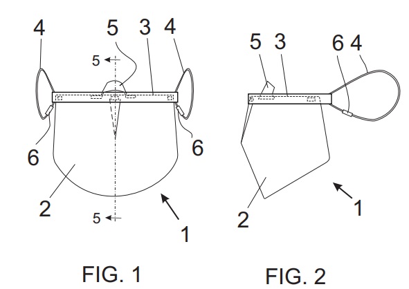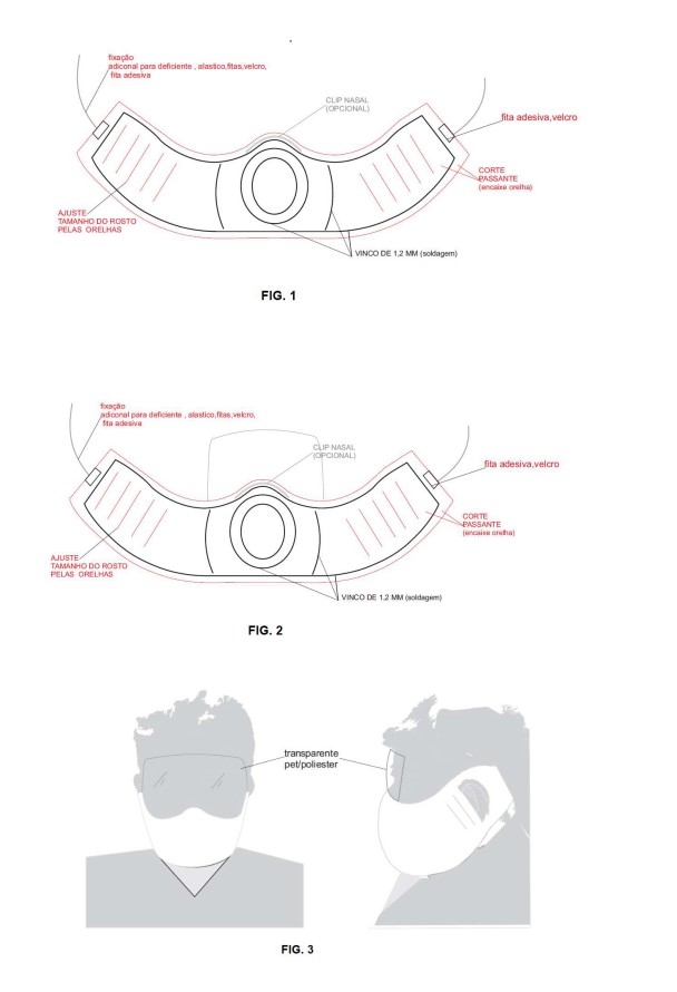O pedido de patente de modelo de utilidade n° BR 202020009294-0 do brasileiro LUCCA TOMIOTTO foi publicado em 11 de maio de 2021. O presente pedido de modelo de utilidade refere-se a máscara protetora (1), pertencente ao setor técnico dos equipamentos de segurança individual, particularmente de uso por profissionais da área de saúde para evitar contaminações, formada por um corpo de material em forma de lâmina, em peça única, anatômico, simétrico, formado: por região central alargada (2), que recobre as narinas, boca e regiões da face adjacentes a estas; por meios (3) de fixação da máscara nas orelhas do usuário formados por prolongamentos laterais da região central (2), que recobrem as laterais da face e dotados de respectivas furações (4) de fixação na orelha do usuário, cada furação (4) formada por uma sucessão de aberturas substancialmente retangulares, ligeiramente curvas, verticais, paralelas (5), separadas umas das outras por faixas intermediárias (6), aberturas (5) essas que são selecionadas pelo usuário, conforme o seu biotipo e enganchadas nas orelhas; dito material em forma de lâmina é, preferencialmente, tecido não tecido, TNT, de polipropileno, referida máscara (1) pode ser monocamada ou formada por três camadas de TNT. O pedido de patente está pendente de decisão, aguardando o início do exame técnico no INPI.