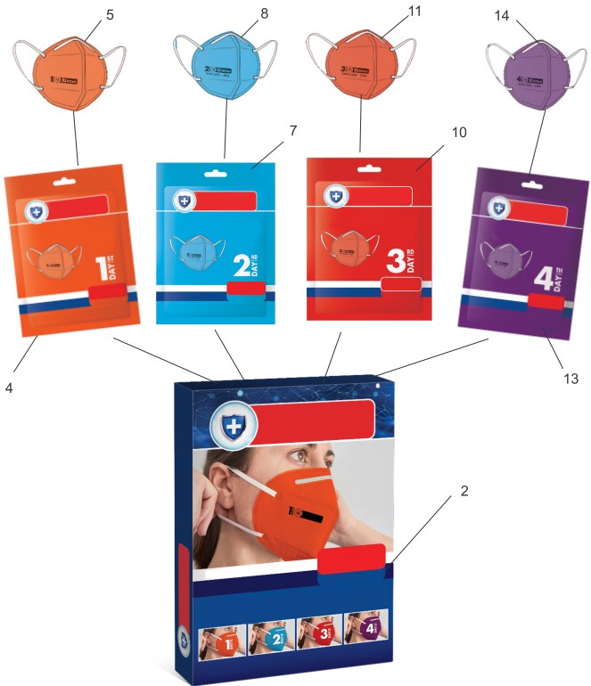 O pedido de patente de invenção n° BR 102020010359-8 do brasileiro ÁLVARO PEREIRA IACCINO foi publicado em 07 de dezembro de 2021. O pedido de patente refere-se a um método que utiliza alternância e padronização de cores em um kit (1) contendo quatro invólucros (4, 7, 10, 13) com quatro máscaras KN95 (5, 8, 11, 14), embaladas individualmente na cor correspondente, sendo os quatro invólucros (4, 7, 10, 13) e as quatro máscaras KN95 (5, 8, 11, 14) identificadas para uso ordenado e sequencial do primeiro (6) ao quarto (15) dia até completar oito ciclos ou trinta e dois dias, desse modo otimizando e universalizando o uso imediato das máscaras KN95 para a sociedade em geral. O pedido de patente está pendente de decisão, aguardando o início do exame técnico no INPI.