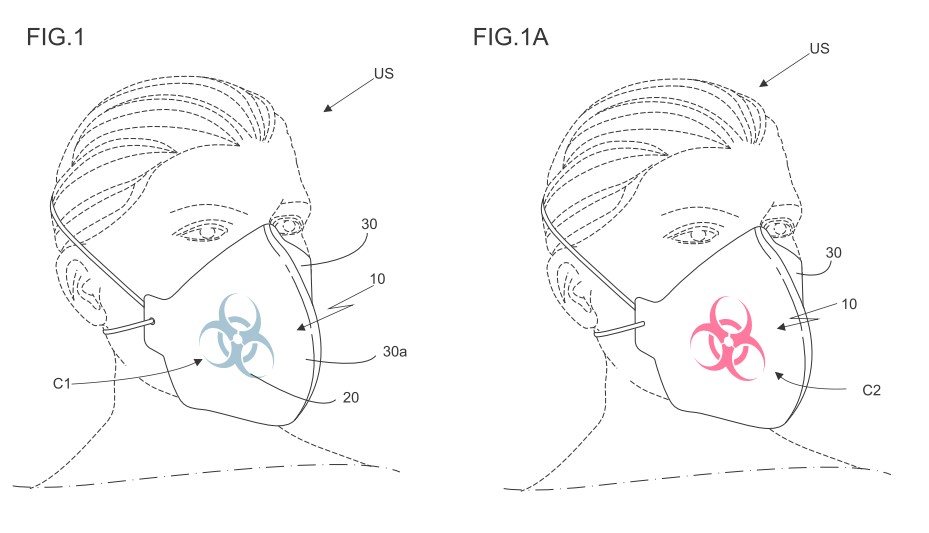 O pedido de patente de invenção n° BR 102020013267-9 do brasileiro MARCELO PEREIRA NUNES foi publicado em 11 de janeiro de 2022. O pedido de patente refere-se a um identificador visual (10) aplicado em máscara respiratória (30) de usuário (US) para proteção contra vírus como covid-19 ou outro similar; dito identificador visual (10) é compreendido por uma impressão gráfica (20) obtida por tinta à base de cloreto de cobalto, a qual é aplicado na face externa (30a) da máscara respiratória (30); dita impressão gráfica (20) passível de ser configurada por logotipo, faixa com gradação, desenho artístico ou outro adequado. O pedido de patente está pendente de decisão, aguardando o início do exame técnico no INPI.