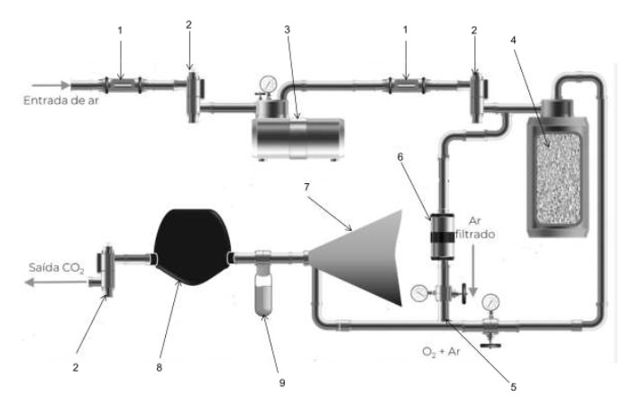 O pedido de patente de modelo de utilidade n° BR 202020025683-7da empresa brasileira UNIVERSIDADE FEDERAL DE SERGIPE foi publicado em 13 de setembro de 2022. O pedido de patente refere-se a um sistema modularizado e portátil de tratamento não invasivo para insuficiência respiratória leve a moderada em pacientes contaminados com patógenos transmissíveis por vias aéreas, como é o caso daqueles afetados pela COVID-19. O sistema precisa de pouca infraestrutura hospitalar para ser operacionalizado. O projeto e o arranjo dos componentes resultam em um sistema capaz de conduzir o fluxo de gases de uma entrada de ar escolhida até o interior da máscara facial (9 de forma contínua. Esse fluxo contínuo renova o ar no interior da máscara (9) rapidamente, evitando que o CO2 exalado se acumule. Como todo o circuito respiratório é isolado e há apenas uma possibilidade de saída para o ar, através do filtro HEPA (4), o sistema evita o lançamento de patógenos no ambiente. Além disso, uma válvula de PEEP (6) pode ser adicionada na saída do sistema para permitir a utilização de pressões positivas nas vias aéreas do paciente. Ainda, uma válvula unidirecional de segurança (8), próxima à entrada da máscara (9), permite apenas a entrada de ar em caso de problemas no suprimento de gases para o paciente. O pedido de patente está pendente de decisão, aguardando o início do exame técnico no INPI.