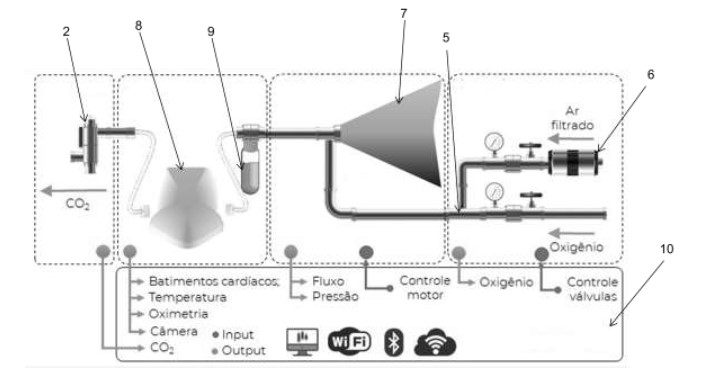 O pedido de patente de modelo de utilidade n° BR 202020016851-2 dos brasileiros RAFAEL AGUIAR DO NASCIMENTO, BORIS PETROVIC, ANDRE PSCHEIDT, CARLOS ALEXANDRE BREYER, EDUARDO AUGUSTO DOS SANTOS CRUZ DE OLIVEIRA, GABRIEL JOSÉ PETROSKI DA SILVA, GIANCARLO ZANON, GILMAR CANALI FERREIRA, JOÃO JACKSON BATISTA BRAGA, JOÃO LUIZ NEVES, JULIANA CORTINES LAXE SILVA, LEONARDO COUTINHO MAYNART ARAGÃO, LIDENIRO ALEGRE, NILSON RIBEIRO MODRO, PAULO MÜLLER, RENATA BANNITZ FERNANDES, ROSANA DE OLIVEIRA MALTA, ROBSON TADEU FIGUEIRO VAZ, SÉRGIO CABRAL CAVALCANTI, SANDRA GUEDES PINUDO DUVOISIN, VINICIUS DO COUTO PINHEIRO, VALENTIM DA CRUZ PAULO FILHO, LUIZ GUSTAVO PAGOTTO SIMÕES, MARCIO FRANÇA DUTRA, JORGE WILSON GONÇALVES LESSA, ALEXANDRE GERALDO ARAUJO LIMA, RAFAEL DE ABREU PEREIRA, LUIS CLAUDIO FRAGA, JOSÉ CARLOS DE CASTRO JUNIOR, SEBASTIÃO CAVAGNOLLI, SERGIO KAZUTOMI ARAKAKI, RODRIGO DIAS ARNAUT, MARCELO DE COL GOMES REZENDE, CHARLES ADRIANO DUVOISIN e ERNESTO AUGUSTO GARBE foi publicado em 03 de março de 2022. O pedido de patente refere-se a um respirador portátil modular automatizado e autoprodutor de oxigênio de forma opcional com esterilizador de ar e monitoramento remoto alternativa de tratamento ao COVID-19 é um aparato inteligente e eficaz para auxiliar como um respirador mecânico e automatizado aos enfermos e vítimas de síndrome respiratória. O aparato é embasado na soma de várias tecnologias já conhecidas e dominadas, tais como ozonizadores (1), filtros UV-C (2), compressor de ar (3), filtro zeólita (4), que será disponibilizado de forma simples e de baixo custo, podendo ser produzido em larga escala. O equipamento possui um módulo de sistema eletrônico de controle e monitoramento (10), que permite o monitoramento remoto do paciente e ajuste remoto do fluxo, volume e pressão do oxigênio a ser injetado no paciente. O pedido de patente está pendente de decisão, aguardando o início do exame técnico no INPI.