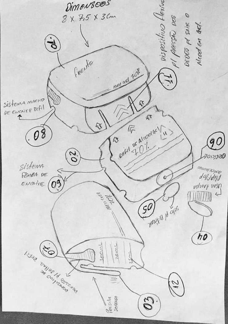 O pedido de patente de modelo de utilidade n° BR 202020008094-1 do brasileiro JORGE GUSTAVO VEIGA DA SILVA foi publicado em 03 de novembro de 2021. O pedido de patente refere-se a um dispositivo pessoal portátil para armazenamento e dispensação de álcool em gel, ou produtos com viscosidade similar, denominado doravante por dispositivo dispensador, constituído por um corpo e um refil de armazenamento, que é acoplado ao corpo, sendo que o corpo possui abertura em sua região inferior, por onde é encaixado o refil que deve possuir configuração construtiva compatível para possibilitar seu devido encaixe, como uma gaveta. Na região superior do dito refil é previsto formato geométrico para melhor direcionamento e encaixe ao corpo, e nas suas laterais, são previstas partes constituintes dos elementos de fixação do refil ao corpo, e na sua parte inferior é previsto o orifício de saída do álcool em gel, ou produto similar, armazenado, compreendendo uma tampa. O corpo possui presilha posicionada na sua região posterior, e na parte superior do corpo é disposta uma alça. Prevê ainda elementos de fixação e liberação do refil ao corpo que resultem em engate rápido de um ao outro, quando montados, com meios de acionamento com configuração compatível ao elemento de fixação e liberação utilizado; prevê ainda uma região de acionamento para liberação do conteúdo disposto internamente ao refil. O pedido de patente está pendente de decisão, aguardando o início do exame técnico no INPI.