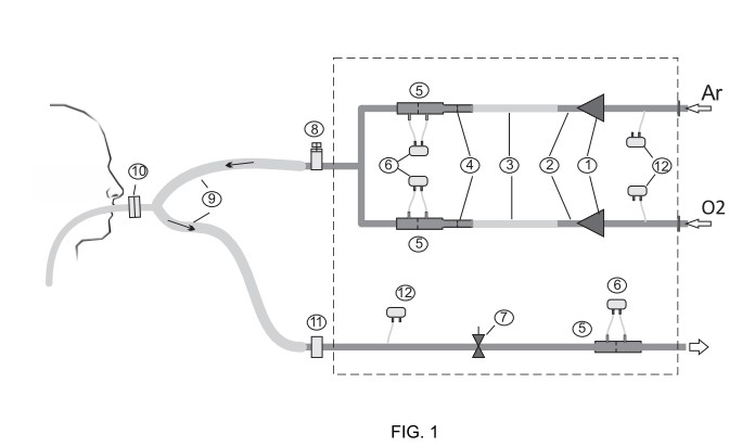 O pedido de patente de modelo de utilidade n° BR102020015383-8 da UNIVERSIDADE FEDERAL DE SANTA CATARINA (BR/SC) e do INSTITUTO FEDERAL DE EDUCAÇÃO, CIÊNCIA E TECNOLOGIA DE SANTA CATARINA foi publicado em 08 de fevereiro de 2022. O pedido de patente de modelo de utilidade refere-se a um sistema de controle de vazão de gases para ventilador pulmonar. O sistema utiliza bicos injetores para controlar a vazão de gases (Ar e O2) em ventiladores pulmonares para uso em terapias intensivas ou de emergência em humanos ou uso veterinário. Para isso, revela-se um sistema composto por dois conjuntos para o Ar e O2, respectivamente, formados cada um por pelo menos um bico injetor (1) interligado opcionalmente por canalização (2) a atenuador de oscilação de vazão formado por uma mangueira de silicone ou outro material elástico (3) unido a restrição para perda de carga (4); por conseguinte, conecta-se a placa de orifício (5) com sensor de pressão diferencial (6), ou outro dispositivo de medidor de vazão, e esses conjuntos são unidos e conectados opcionalmente a válvula de alívio de pressão (8) em conexão com a traqueia (9), que está interligada opcionalmente a um filtro HEPA (11), que é unido a pelo menos uma válvula (7), que está conectada a placa de orifício (5) com sensor de pressão diferencial (6), ou outro dispositivo de medidor de vazão; a dita traqueia (9) é acoplada a um filtro HEMF (HEPA + Umidificador) (10) e compreende-se ainda, de sensores de pressão relativa (12) nos bicos injetores (1) e entre a ligação do filtro HEPA (11) e a válvula expiratória (7). O pedido de patente está pendente de decisão, aguardando o início do exame técnico no INPI.