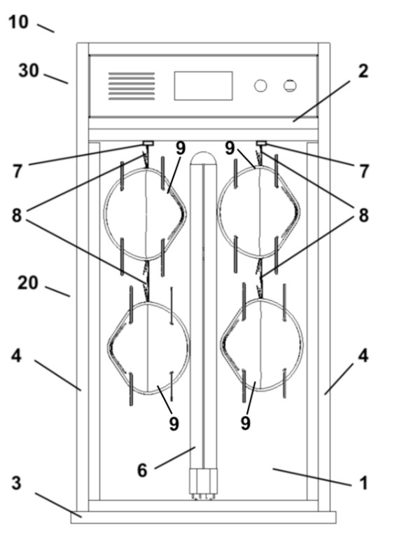 O pedido de patente de invenção n° BR 102020025875-3 da empresa brasileira FUNDAÇÃO UNIVERSIDADE DE BRASILIA foi publicado em 28/06/2022. O pedido de patente refere-se a sistema de radiação baseia-se na utilização de radiação UV-C (254 nm) que é absorvida no RNA e DNA celular, formando dímeros que impedem a replicação de patógenos e a sua capacidade de infectar. Essa qualidade torna a energia UV-C uma maneira eficaz, ambientalmente amigável e livre de produtos químicos para desinfecção de ambientes. O sistema projetado leva em consideração as dimensões do local, potência da fonte de radiação, nível de contaminação do ambiente, objetos no recinto, rugosidade e porosidade das superfícies, distância entre a luz e o alvo de desinfecção, a disponibilidade de tempo para descontaminação e a resistência efetiva dos microrganismos que serão eliminados. A presente invenção refere-se a um dispositivo de desinfecção que utiliza radiação na região do ultravioleta UV-C (254 nm) para reduzir a proliferação de agentes patógenos tais como vírus, bactérias e fungos. O pedido de patente está pendente de decisão, aguardando o início do exame técnico no INPI.