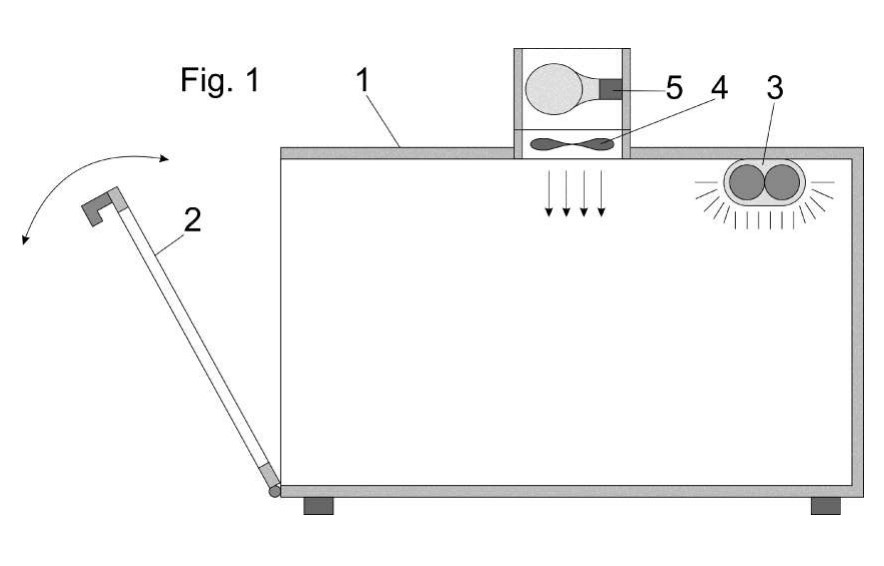 O pedido de patente de modelo de utilidade n° BR 202020012662-3 do brasileiro HUGO ABRAHÃO DE LIMA (BR/RJ) foi publicado em 28 de dezembro de 2021. O pedido de patente refere-se a uma disposição construtiva aplicada em uma caixa dotada em seu interior de uma lâmpada UV-C, a ser utilizada para descontaminar alimentos e objetos que possam ter sido processados ou manipulados por pessoas eventualmente contaminadas por algum tipo de agente nocivo à saúde, como atualmente tem sido divulgado o mundialmente preocupante coronavírus. O pedido é basicamente constituído de uma caixa (1) com isolamento térmico opcional, com porta (2) preferencialmente frontal e dotada, internamente, de uma ou mais lâmpadas UV-C (3) e, opcionalmente, de um cooler superior (4) acoplado à uma lâmpada de aquecimento (5). O pedido de patente está pendente de decisão, aguardando o início do exame técnico no INPI.