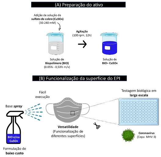 O pedido de patente de invenção n° BR 102020020907-8 da universidade brasileira UNIVERSIDADE ESTADUAL DE CAMPINAS (UNICAMP) foi publicado em 24 de abril de 2022. O pedido de patente refere-se a um processo de recobrimento de equipamentos de proteção individual com spray para conferir propriedades virucidas aos mesmos. A presente invenção possui aplicação na indústria de produção de equipamentos de proteção individual (EPIs), principalmente contra a COVID-19. O pedido de patente está pendente de decisão, aguardando o início do exame técnico no INPI.