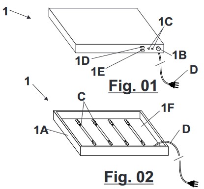 O pedido de patente de modelo de utilidade n° BR 20 2021 012464 0 do brasileiro ALLOY ILUMINAÇÃO LTDA foi publicado em 03 de janeiro de 2023. O pedido de patente refere-se a um esterilizador híbrido, pertencente ao campo dos artigos para esterilização de equipamentos, dispositivos e ambientes; mais precisamente compreende um equipamento constituído a partir de um gabinete prismático retangular de reduzida espessura dotado de duas portinholas com aberturas basculantes em sua face inferior, as quais se abrem do centro para os lados e são acopladas em servo motores elétricos por meio de braços articulados, sendo que as faces laterais menores do gabinete possuem aberturas para ventilação, de sorte que uma delas é dotada de um ventilador e, além disso, o gabinete ostenta em seu interior múltiplas lâmpadas UV-C tubulares posicionadas lado a lado e longitudinalmente, as quais são movimentadas, para fora e para dentro do gabinete, por um atuador tipo pistão. O pedido de patente está pendente de decisão, aguardando o início do exame técnico no INPI.
