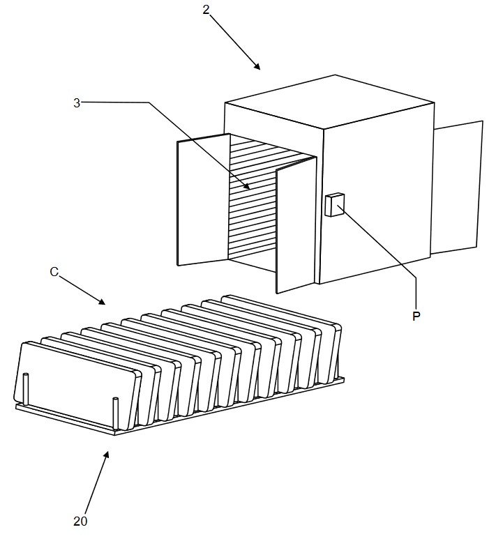 O pedido de patente de modelo de utilidade n° BR 202020008726-1 do brasileiro RAFAEL AUGUSTO PAES DE OLIVEIRA (BR/SP) foi publicado em 09 de novembro de 2021. O pedido refere-se a uma câmara autoportante, automatizada, para esterilização e desinfecção de agrupamentos de carrinhos de supermercado, carrinhos de compras e carrinhos (C) de lojas de departamento em geral, através de radiação provinda de lâmpadas de LED emissoras de raios UV-C (L). Para tanto, as lâmpadas (L) são instaladas com seus reatores (R) em calhas (25), por sua vez aparafusadas ao longo de uma câmara (1) composta por uma disposição de vigas, colunas, travessas, chapas dobradas e carenagens, vazadas por furação (F) para aparafusamento entre si. A câmara (1) é formada com um portal (2) com porta de entrada (22), chapa traseira (6), carenagens laterais (9) e chapa superior (19). Após instalada a câmara junto ou mesmo dentro de supermercados e similares, efetuando-se programação de tempo e intensidade de radiação através de um painel de comando eletroeletrônico (PA), sob ação das lâmpadas de LED emissoras de raios UV-C (L), agrupamentos de carrinhos (C) de supermercado, carrinhos de compras e carrinhos de lojas de departamento em geral têm suas superfícies esterilizadas e desinfetadas. O pedido de patente de invenção está pendente de decisão, estando em fase de exame técnico no INPI.