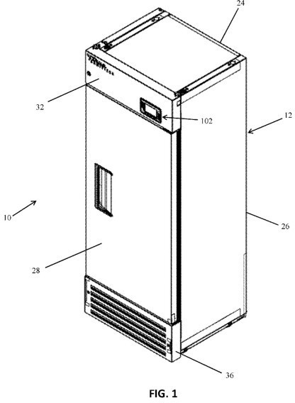 O pedido de patente de invenção n° BR11 2022 021820-6 da empresa americana TRUE MANUFACTURING CO., INC. foi publicado em 13 de dezembro de 2022. O pedido de patente refere-se a Um sistema de armário de desinfecção (10) inclui passagem de distribuição de ozônio (16) em comunicação fluida aberta com um compartimento de desinfecção (14) dentro de um armário (12). Um gerador de ozônio (18) e um movedor de ar de desinfecção (20) estão localizados na passagem de distribuição de ozônio (16). O movedor de ar de desinfecção (20) move ar a partir do compartimento de desinfecção (14) através do gerador de ozônio (18) para formar ar ozonizado e move o ar ozonizado a partir da passagem de distribuição de ozônio (16) para dentro do compartimento de desinfecção (14). Um sistema de controle controla o gerador de ozônio (18) e movedor de ar (20) com base em feedback a partir de um sensor de ozônio (56) indicando exposição a ozônio ao longo do tempo. Um dispositivo de conversão de ozônio (22) é montado em uma parede divisória (36) do armário (12) no exterior do compartimento de desinfecção (14). A parede divisória (38) tem furos de entrada e saída , e o dispositivo de conversão de ozônio (22) tem câmaras a montante e a jusante em comunicação com os furos de entrada e saída. Amortecedores que podem ser seletivamente abertos separam câmaras a montante e a jusante a partir de uma câmara de conversão de ozônio na qual o catalisador de conversão de ozônio é recebido. O pedido de patente está pendente de decisão, aguardando o início do exame técnico no INPI.