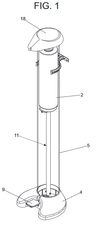 O pedido de patente de modelo de utilidade n° BR 202020011745-4 do brasileiro FLAVIO BARBOSA (BR/SP) foi publicado em 21 de dezembro de 2021. O pedido de patente refere-se a uma disposição construtiva introduzida em suporte de pedal para aplicação de produtos líquidos, pertencente ao setor de acessórios para higiene pessoal, mais particularmente, trata-se de um suporte acionado por pedal para liberar produtos líquidos como: álcool gel, sabão líquido ou outro produto similar, sem a necessidade de usar as mãos em seu acionamento para evitar contaminações no recipiente, obtendo-se resultados práticos, seguros e funcionais muito vantajosos. O suporte compreende uma base de sustentação (1) sobre a qual é fixada uma base de articulação (2) do pedal (3) e a estrutura (5) vertical que é dotada na extremidade inferior de um rasgo (52) que mantém o pedal (3) livre, que ao ser pressionado para baixo, este faz o movimento de alavanca, empurrando para cima um prolongador (7), o qual empurra o frasco (F) para cima, pressionando a válvula dosadora (VD) na alça (6), acionando assim a mesma e liberando o líquido sem o uso das mãos. Dita alça (6) é dotada na face superior de uma placa (8) que poderá ser utilizada para descrição do produto e/ou como propaganda. O pedido de patente está pendente de decisão, aguardando o início do exame técnico no INPI.