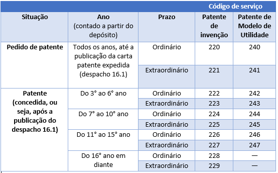 Para cada anuidade, você tem 3 meses de prazo ordinário ou então 6 meses de prazo extraordinário para realizar o pagamento. O valor para pagamento no prazo extraordinário é maior que no prazo ordinário. O valor também varia dependendo se o pedido ou a patente é de invenção ou de modelo de utilidade. Para mais informações consulte a Tabela de Retribuições de Patentes.