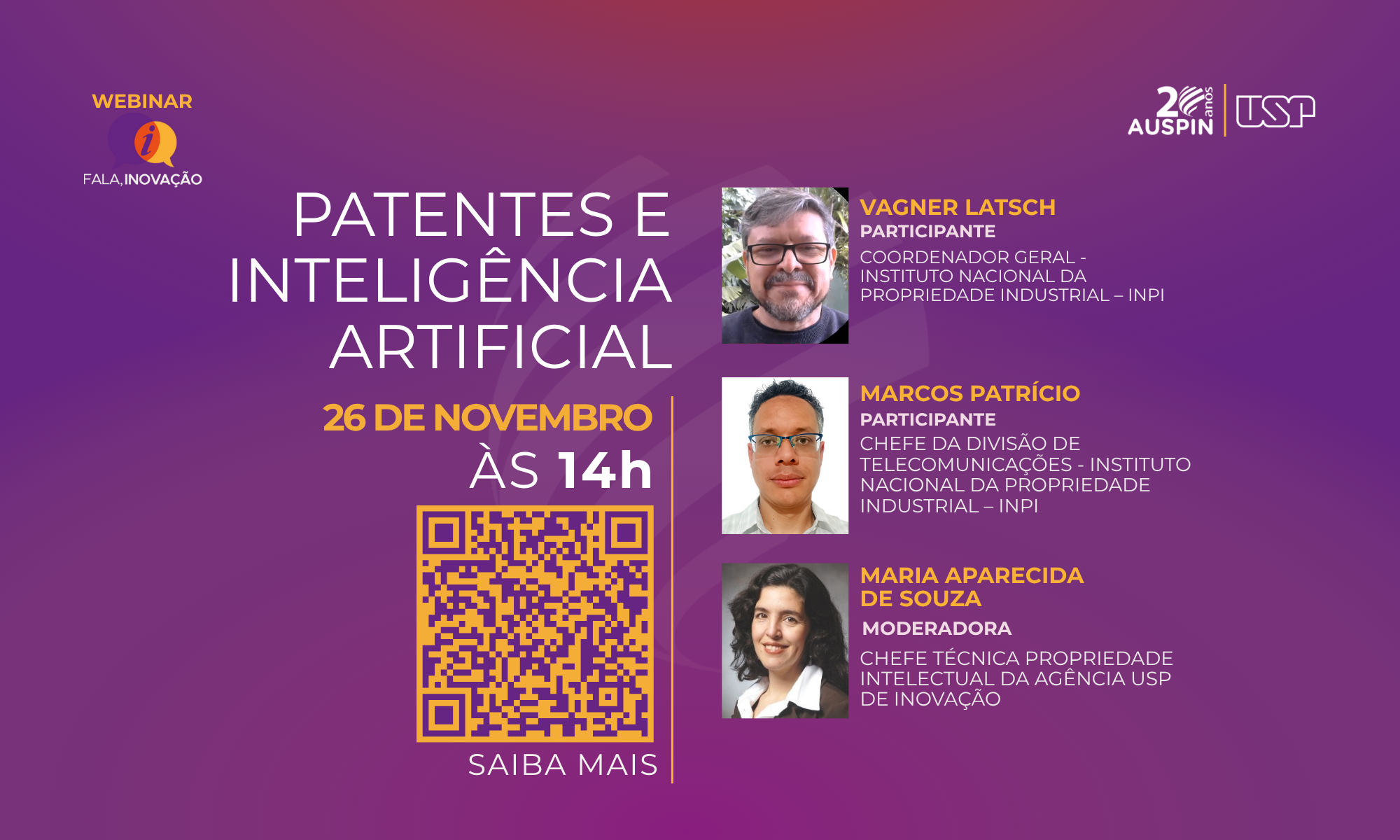 Webinar promovido pela Agência USP de Inovação, abordando temas de patentes, IA e inovação, com transmissão via YouTube.
