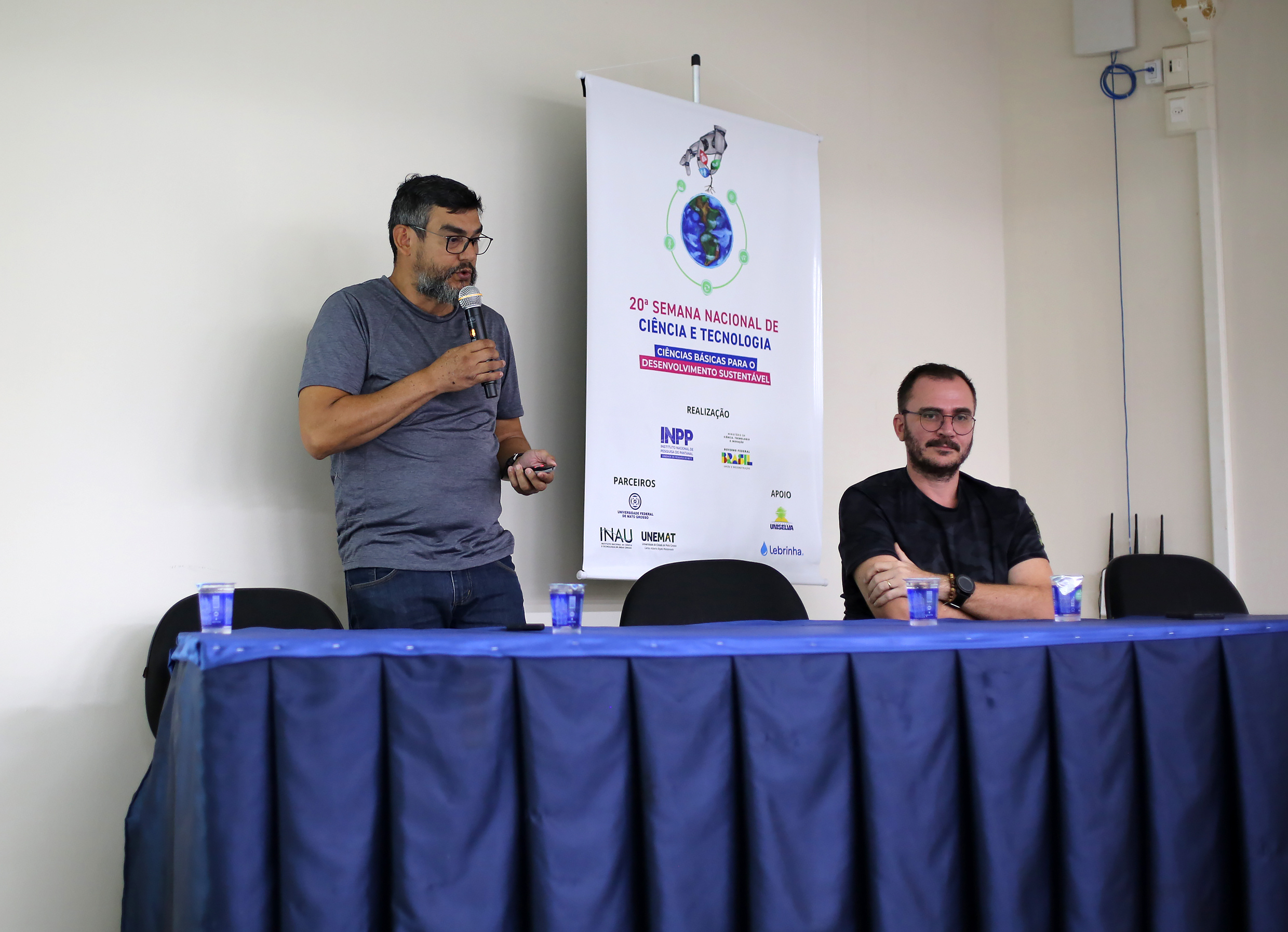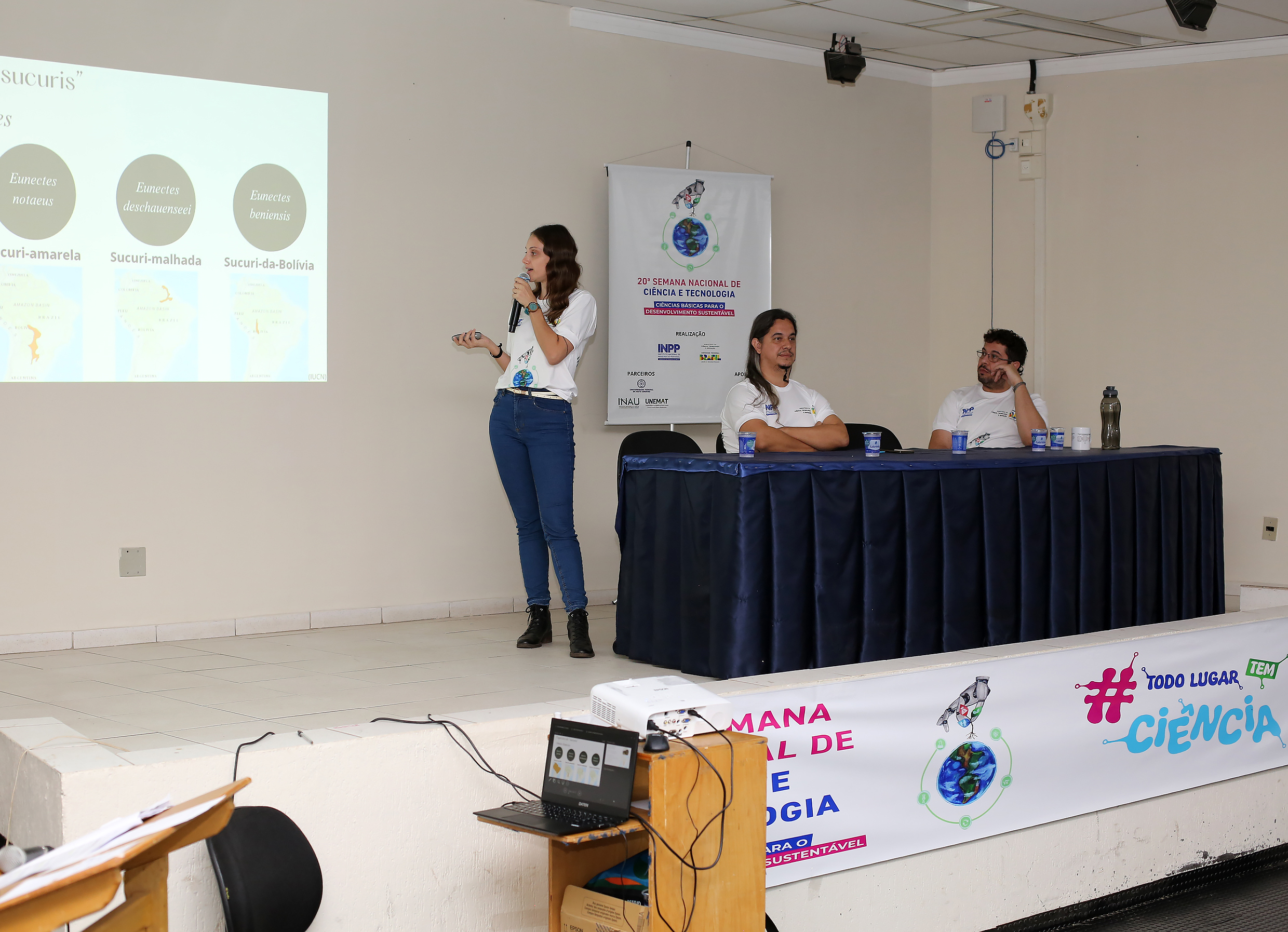 Durante a manhã, “Educação Científica para o Século XXI em Tempos de Mudanças” tematizou a primeira palestra, ministrada pela Profa. Dra. Iramaia Jorge Cabral de Paula. Os Profs. Drs. Claumir Cesar Muniz e Ernandes Sobreira Oliveira Junior abordaram “Ambientes Aquáticos do Pantanal e Aplicação de Tecnologias” como tema para a primeira mesa redonda.