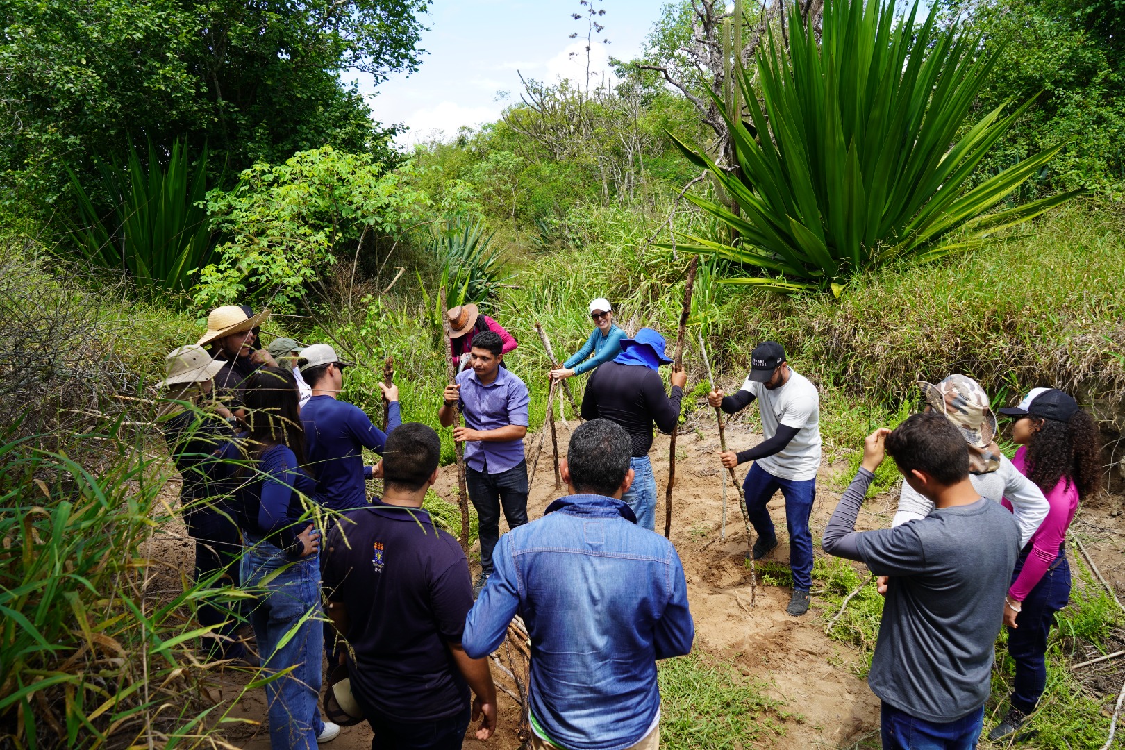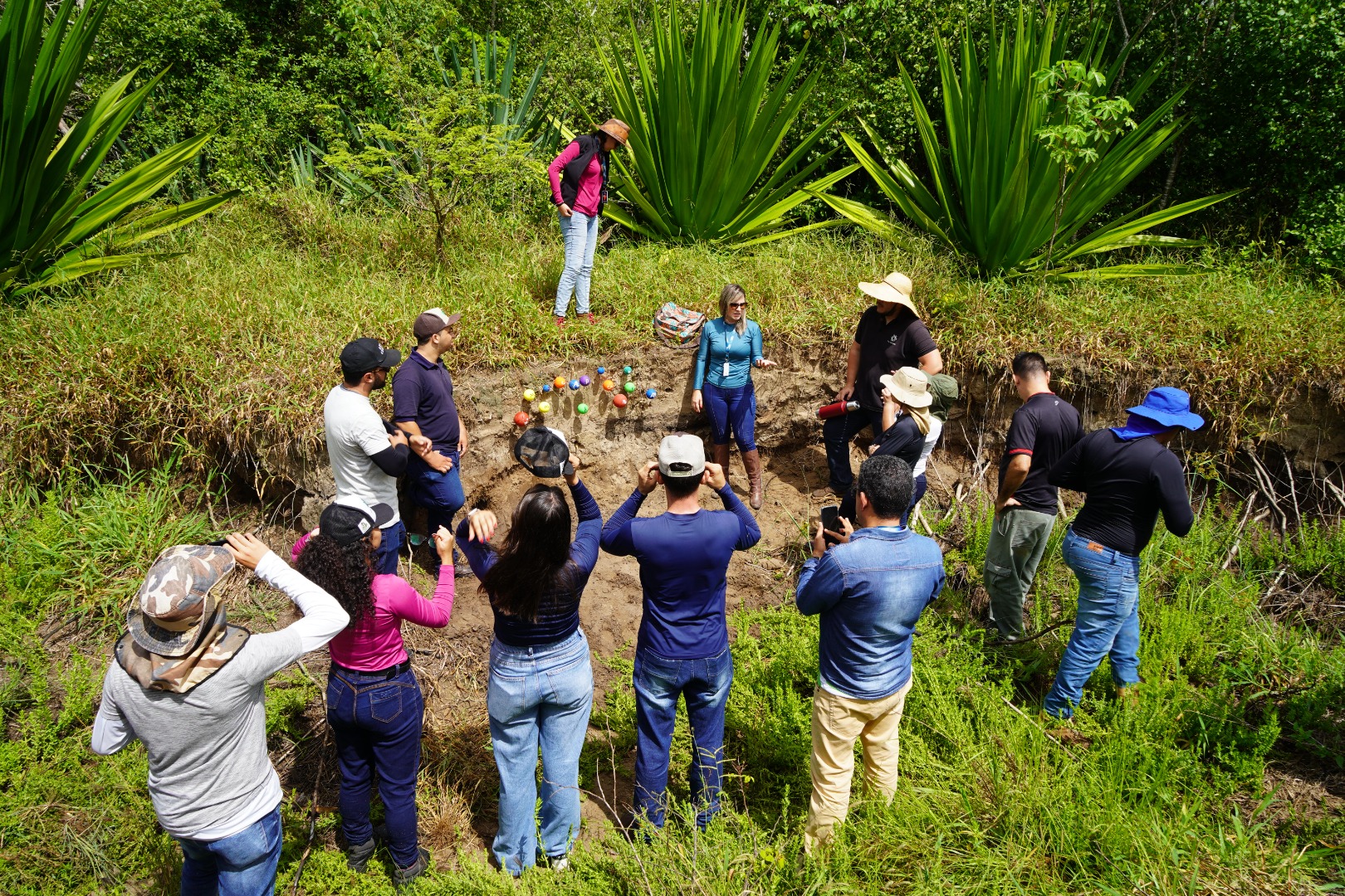 O grupo foi recebido na Estação Experimental Professor Ignácio Salcedo pelas pesquisadoras bolsistas Érica Lambais, Kalline Carneiro e Letícia Moro. A programação da oficina foi dividida em três etapas no campo, em que foram abordadas causas e consequências da degradação, além de técnicas utilizadas para recuperação de solos degradados.