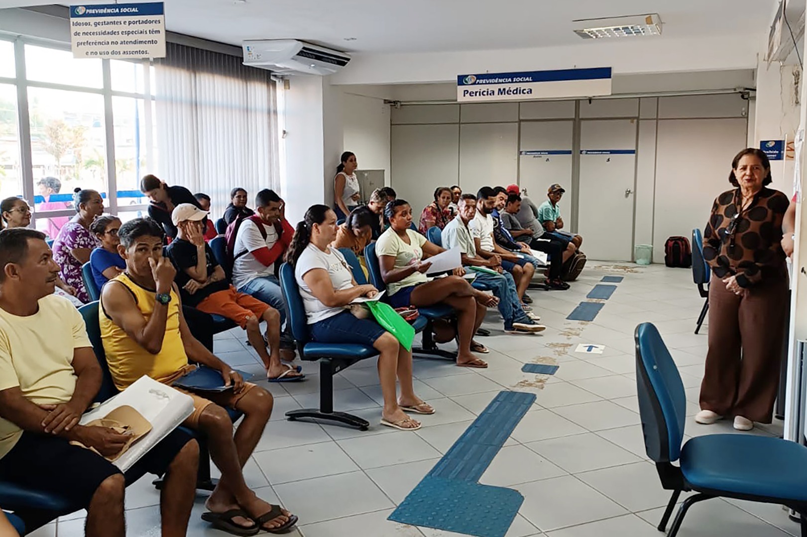 Descrição da imagem: Segurados do INSS aguardam atendimento durante mutirão de atendimento em Cruzeiro do Sul (AC). Foto: Secom/AC.