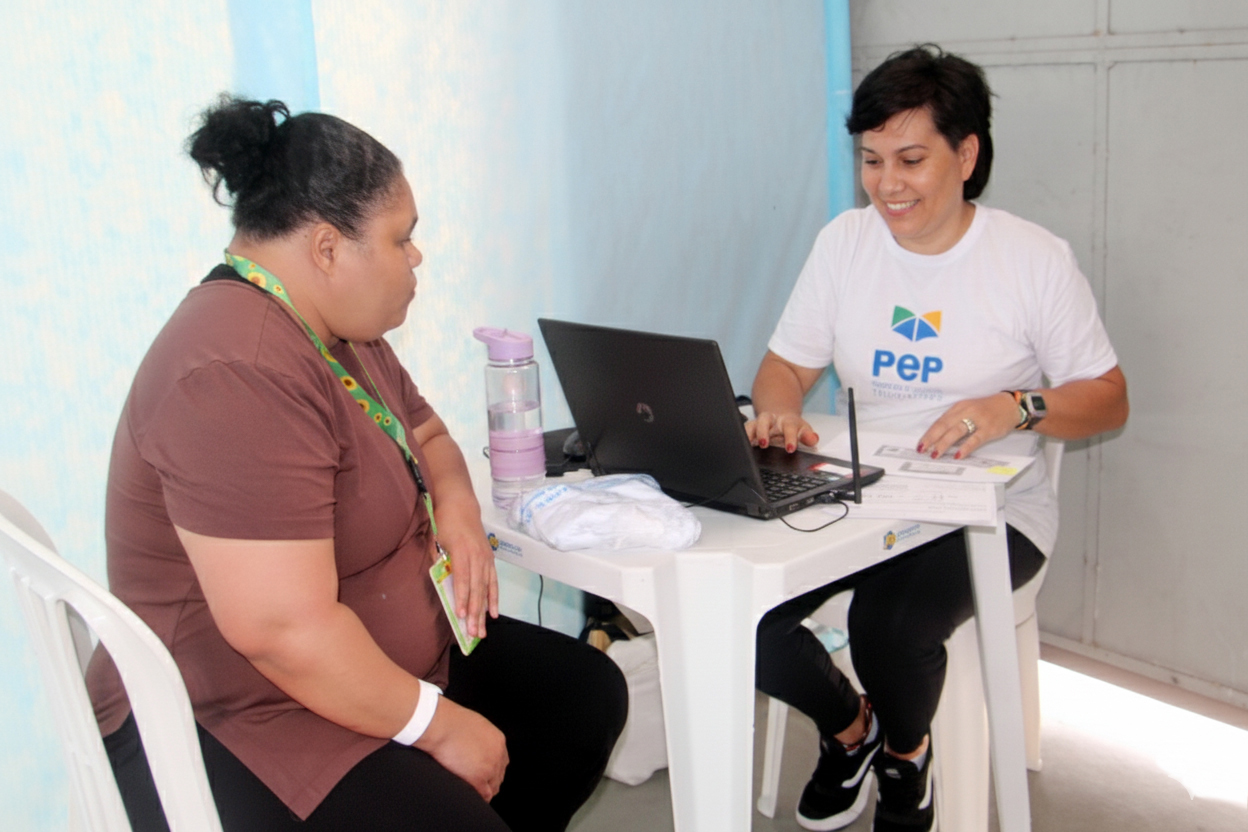 Atendimento inicial realizado por servidor durante mutirão em Planaltina (DF).
