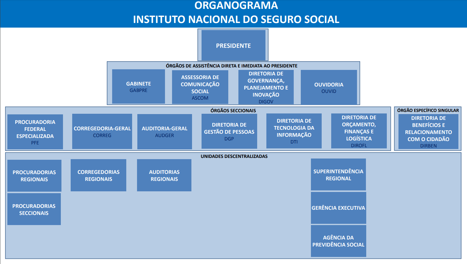 Desenho de organograma do INSS com caixas azuis e letras brancas e pretas