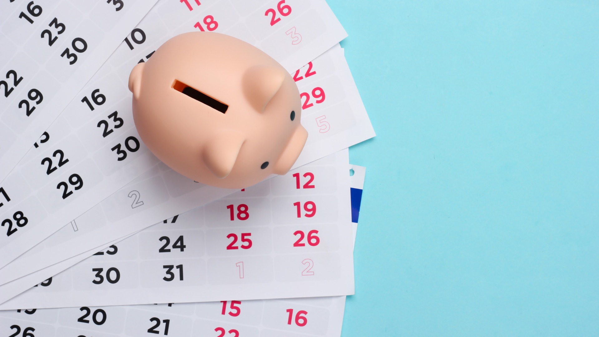 Audiodescrição para cegos: porquinho cofre em cima de folhas de calendário num fundo azul
