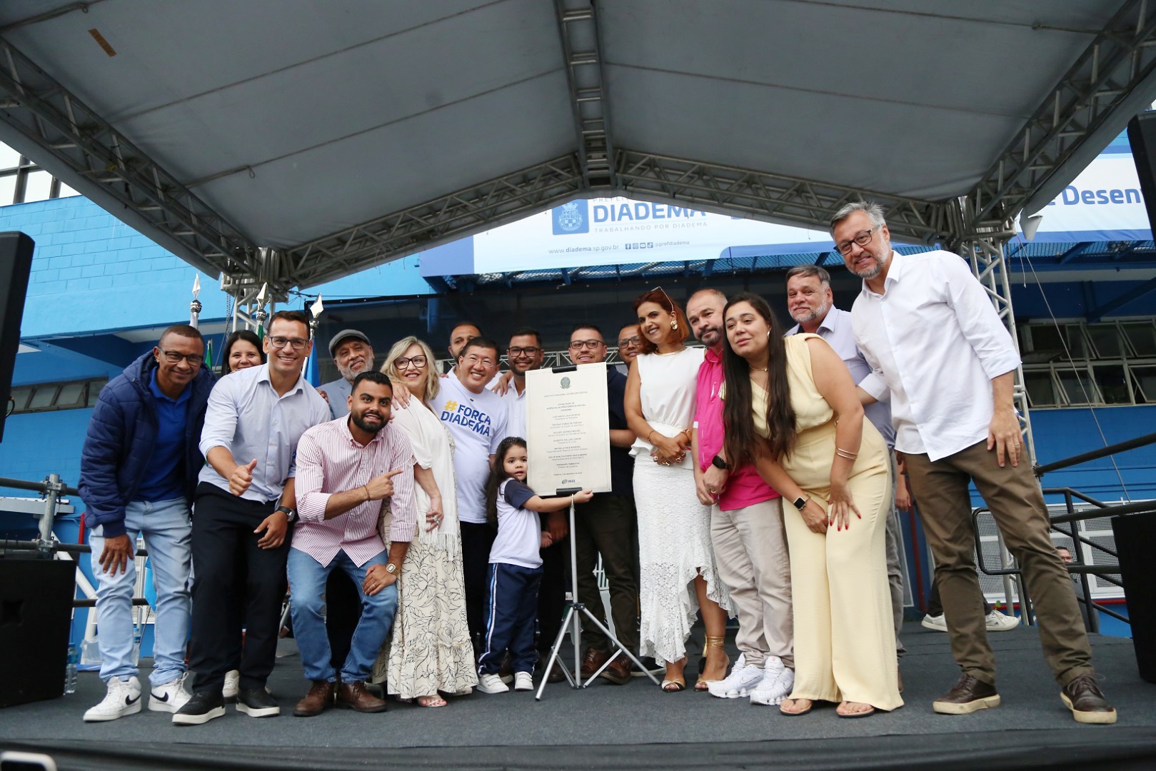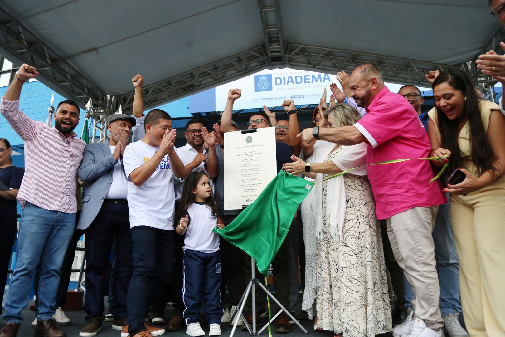 Representantes do INSS e da Prefeitura de Diadema posam com a placa de inauguração. Foto: Carlinhos / ACS SP