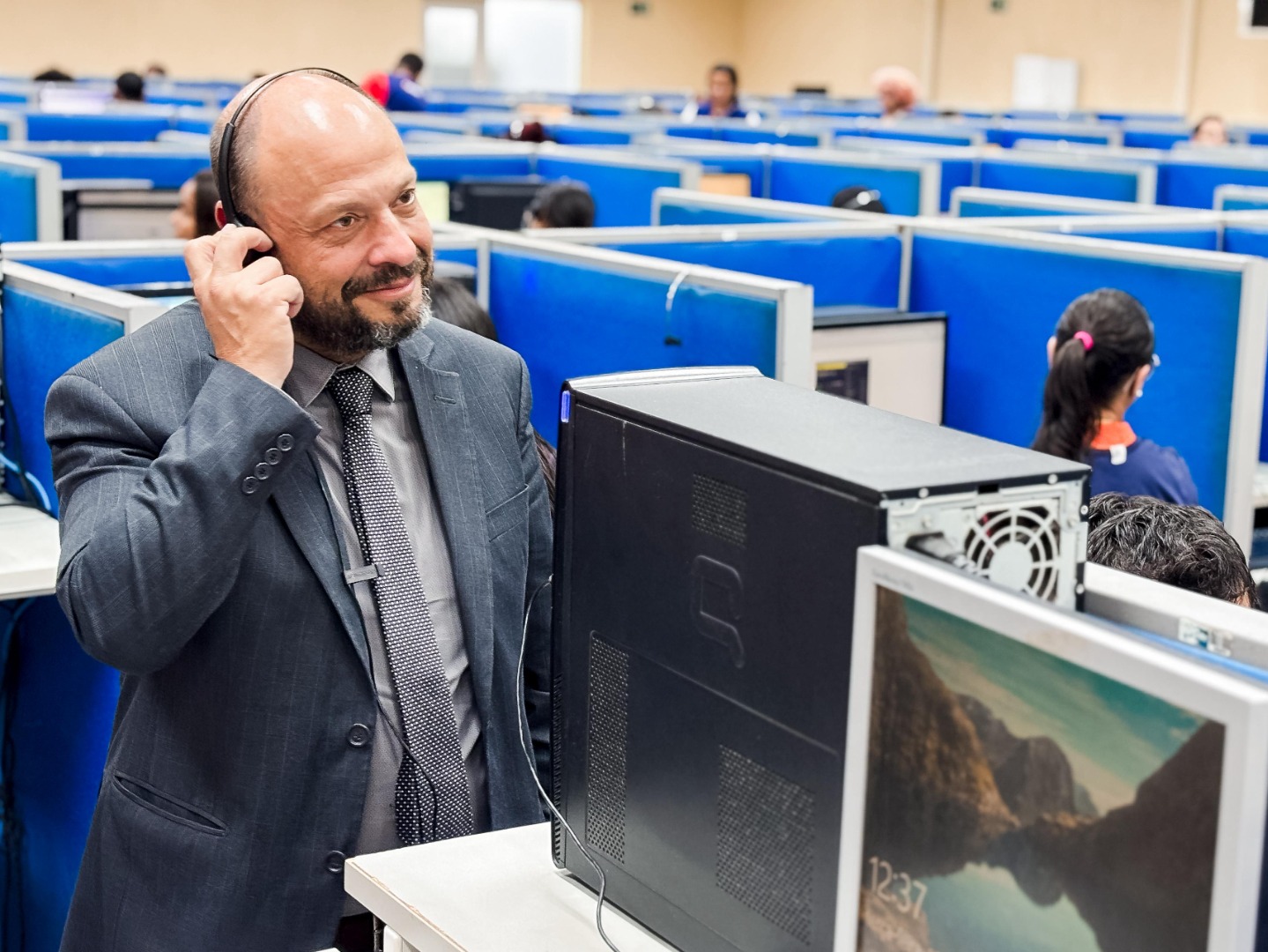 Descrição da imagem: Presidente do INSS acompanha atendimento na Central 135. Ele está em frente a um computador, usando um fone de ouvido. Foto: Roneymar Alves Gomes/ ACS Nordeste.