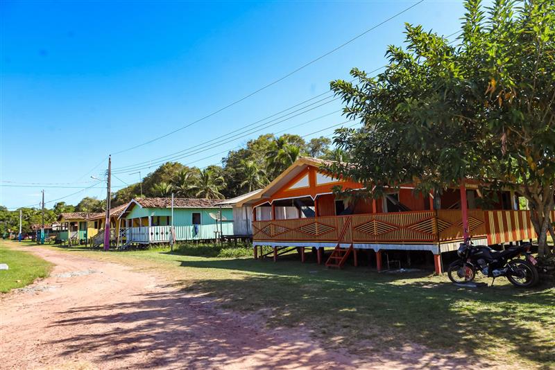 Descrição da imagem: Casas no município de Soure, na Ilha de Marajó, no Pará. As edificações são coloridas com palafitas. Foto: Agência Pará.